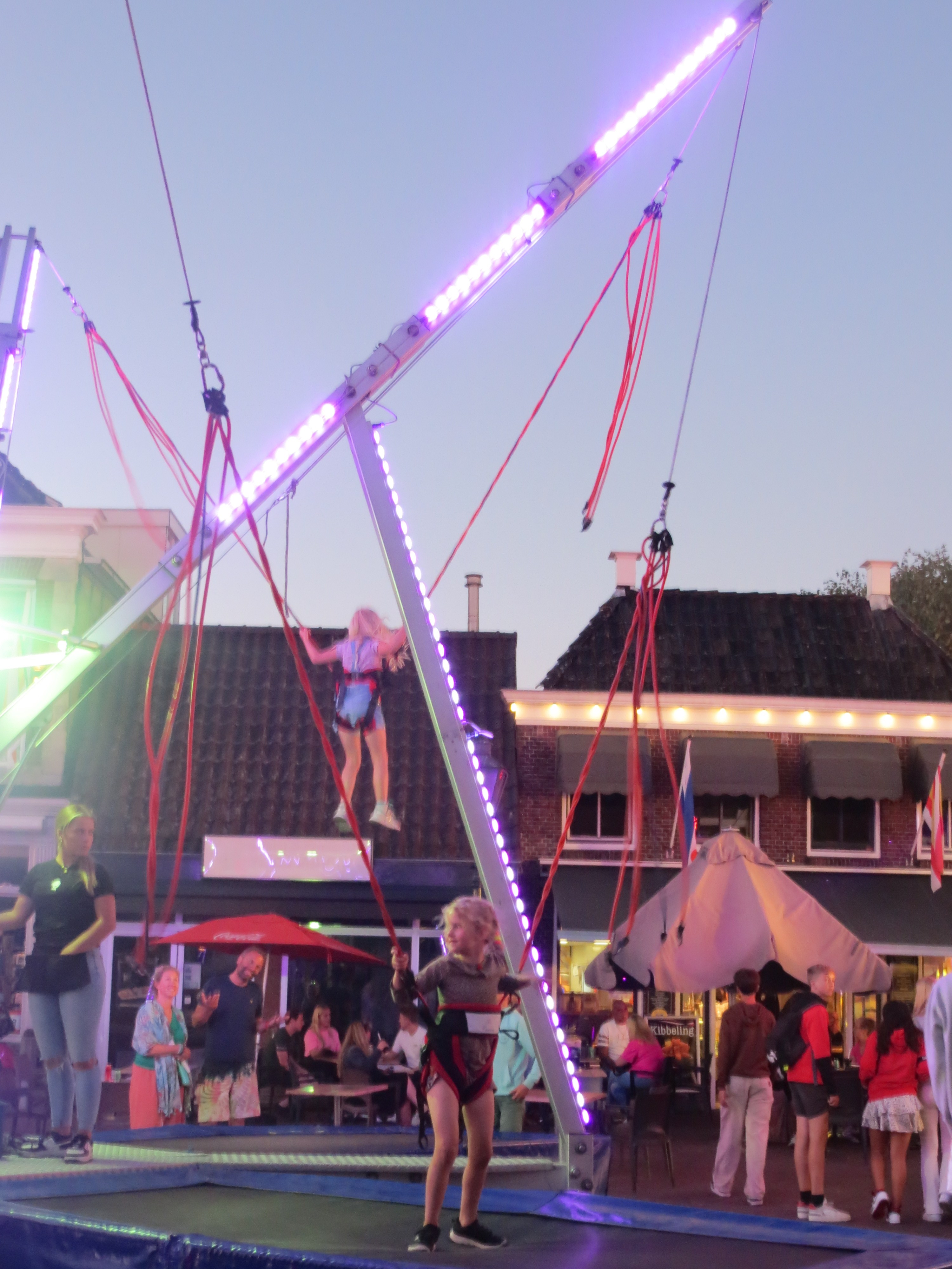 Die Trampolinanlage bietet auf jeder Trampolinfläche ein Geschirr, das das Kind umlegen kann und wo über lange Gummiseile ein großer Teil des Körpergewichts abgefangen wird. Dadurch sind gefahrlos Sprünge von über 4m Höhe möglich.