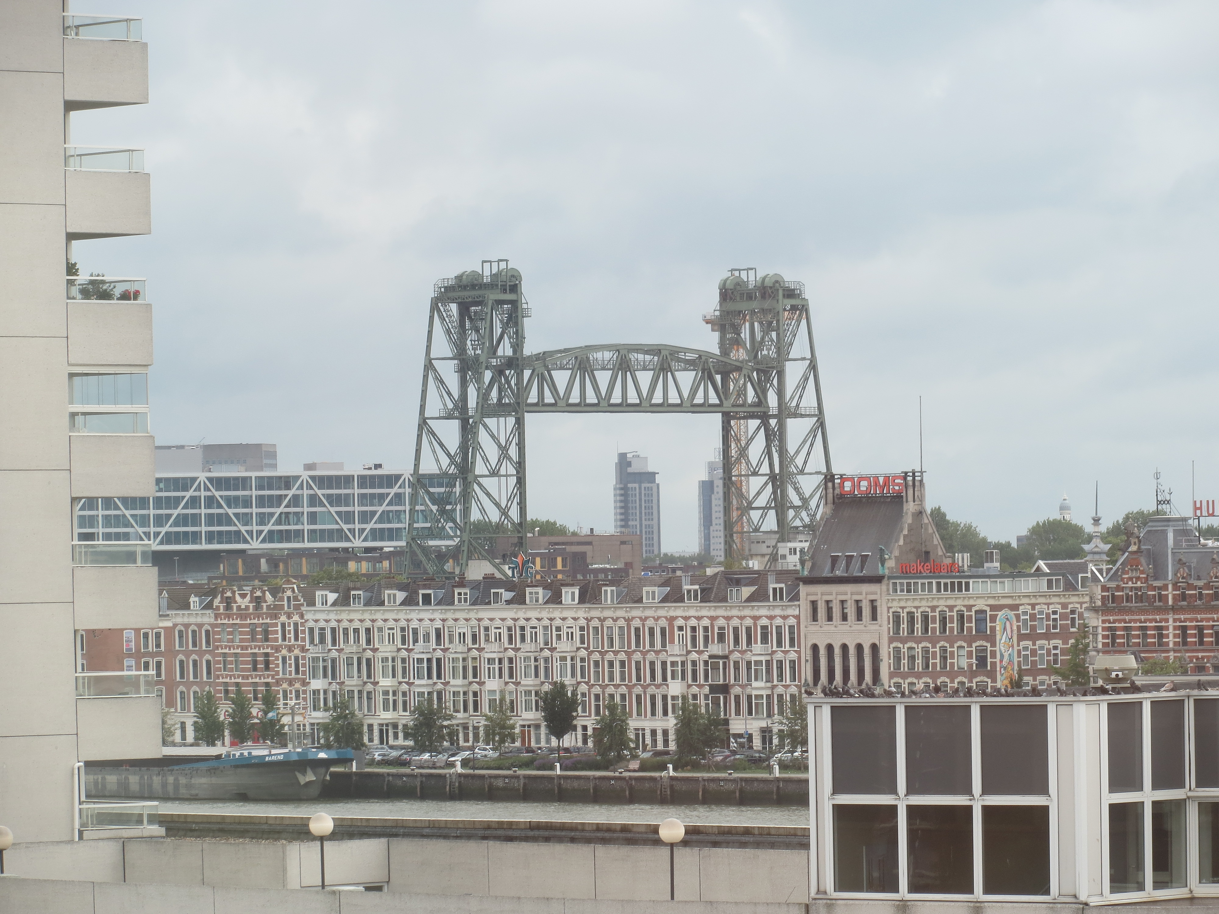 Die Koningshavenbrug ist eine ehemalige Eisenbahnbrücke, die seit 1927 einen Seitenarm der Maas überquert. Sie war als Hubbrücke ausgeführt, und wenn die Gleise ganz hochgefahren sind (wie auf dem Foto zu sehen), kann ein Schiff mit einer Höhe bis zu 45m darunter durchfahren.