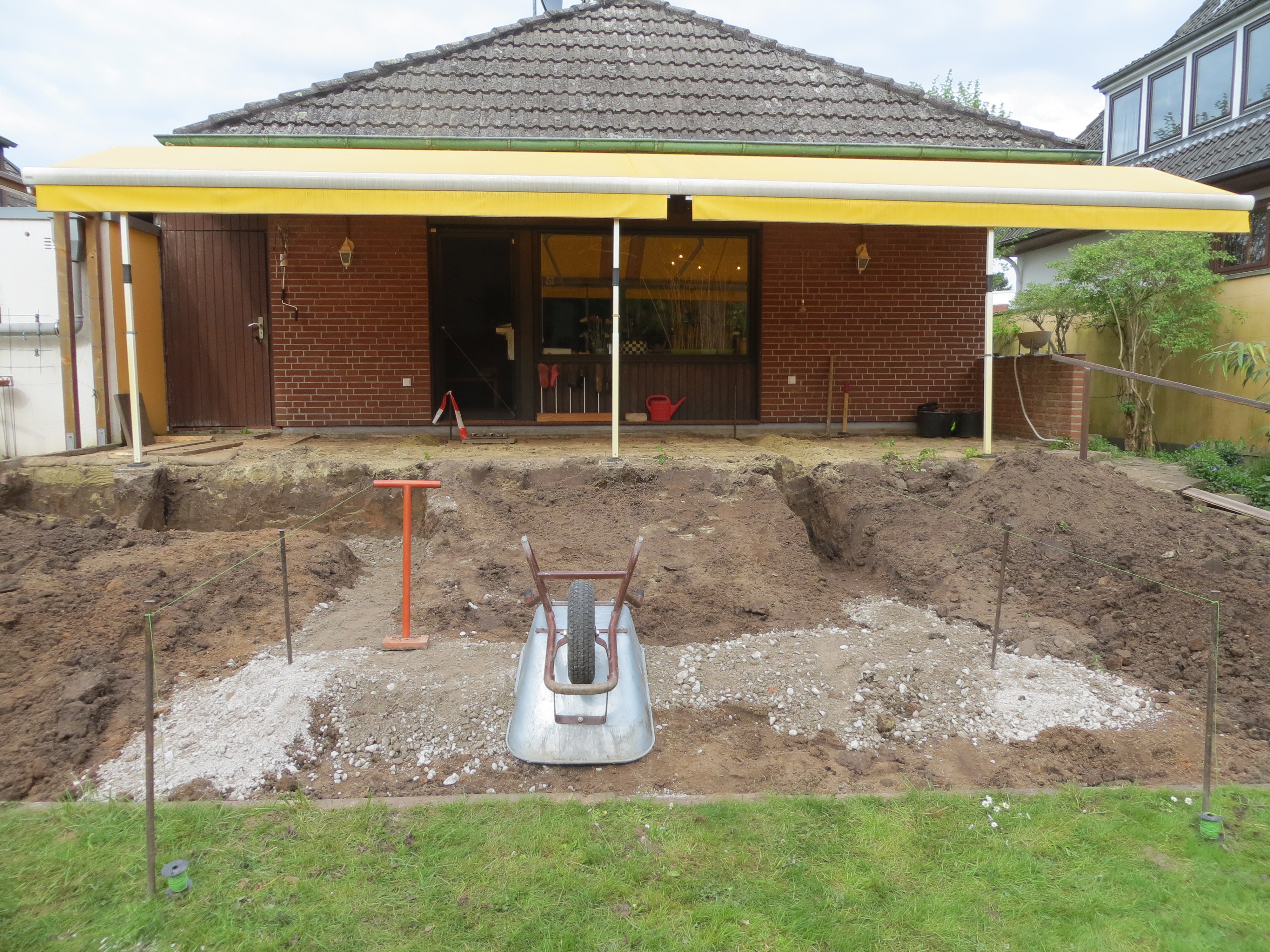 Die Grabungsarbeiten beginnen. Man kann hier schon erkennen, wo die Stützmauern für die alte Terrasse und die Erweiterung ihren Platz finden.