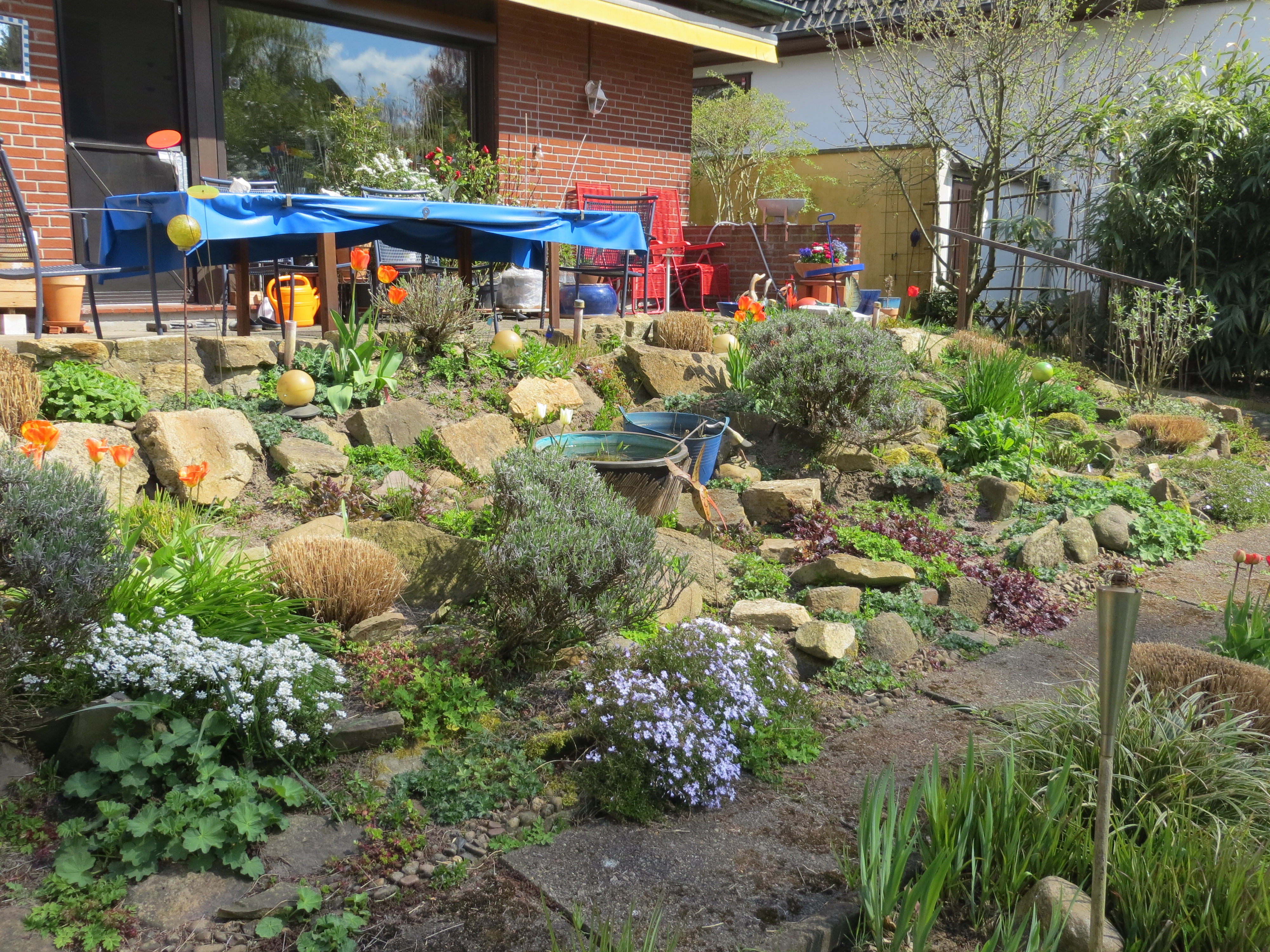 So sah es vorher aus, unser Hangbeet an der Terrasse. Romantisch, aber mit Risiko. Ricci ist beim Arbeiten im Beet schon mehrmals weggerutscht und fast gestürzt. Eine solche Gefahrenquelle können wir uns auf Dauer nicht leisten. Deshalb enstand der Plan, das Beet zu terrassieren.