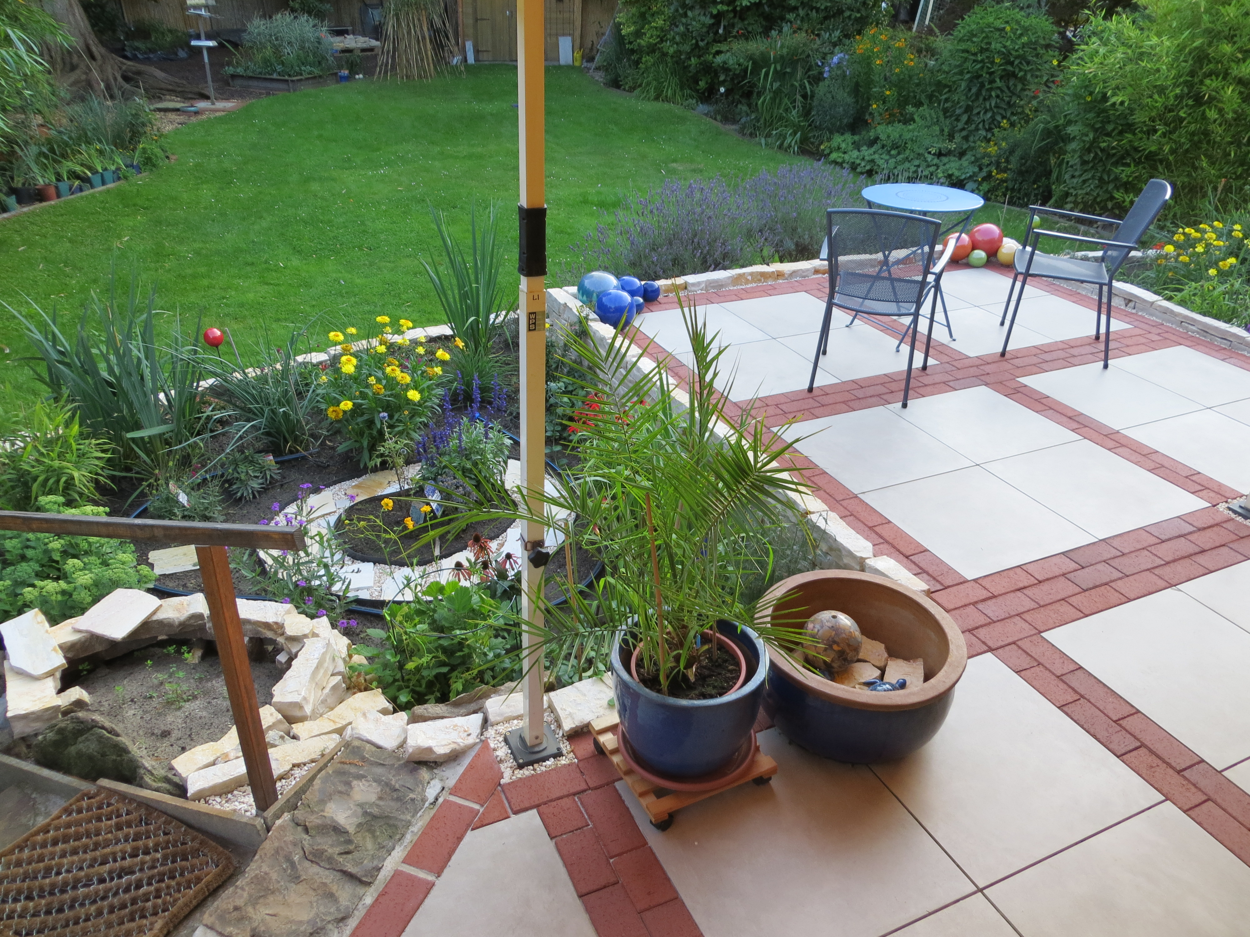 In beiden Beeten neben der "Bühne" habe wir kleine Rundwege angelegt. Das macht es einfacher, die notwendigen Pflegearbeiten auszuführen. Links vom Rundweg sieht man das Sandarium, das den Sandbienen als neue Heimat dienen soll. Bereits drei Tage nach der Errichtung sind die ersten Bienen eingezogen. Leider ist der ursprüngliche Haufen aus Sand und Lehm inzwischen durch den Dauerregen plattgewaschen. Hoffentlich haben die Larven es überlebt und finden im nächsten Jahr den Weg nach draußen.