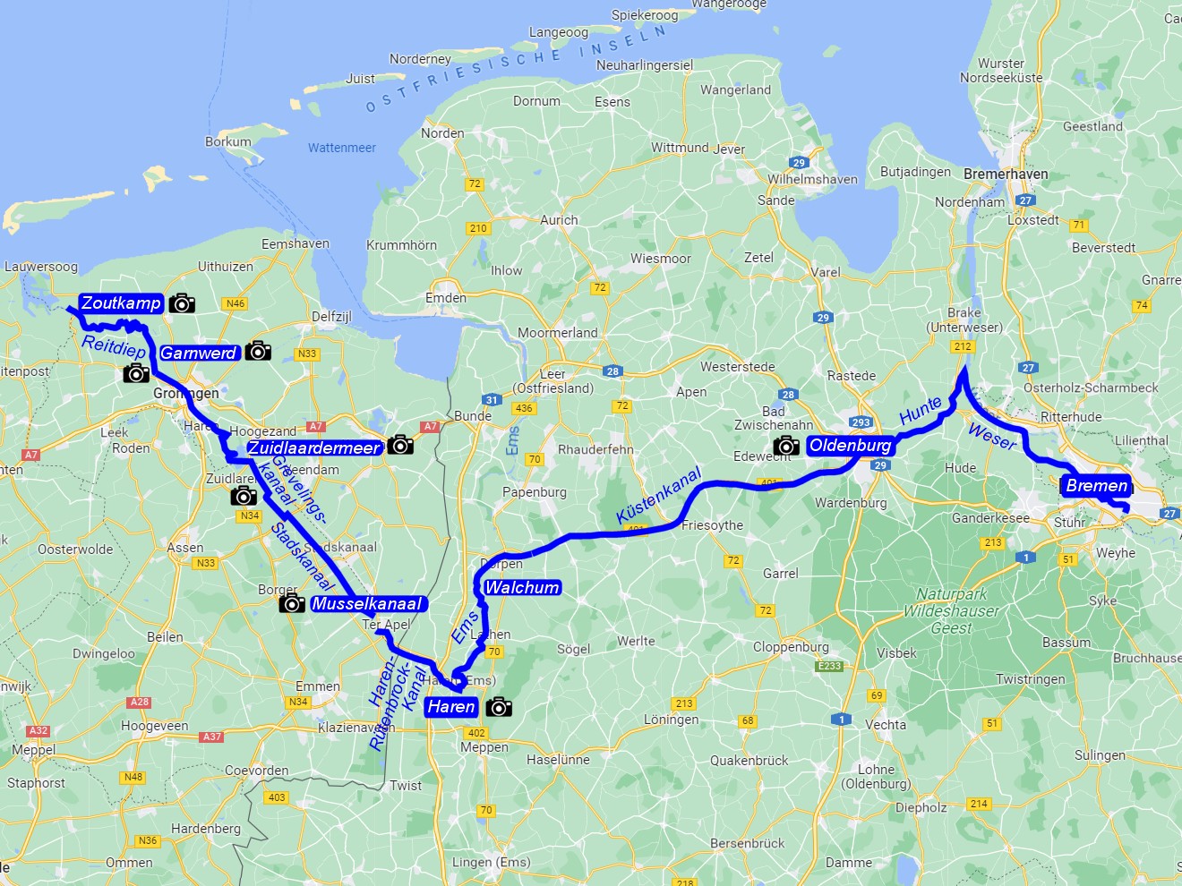 Unsere erste Etappe war die Fahrt über die Weser und die Hunte nach Oldenburg. Von dort ging es über den eintönigen Küstenkanal bis zur Ems in die Marina Walchum. In Haren an der Ems zweigt der Haren-Rütenbrock-Kanal ab, der die Niederlande mit Deutschland verbindet.