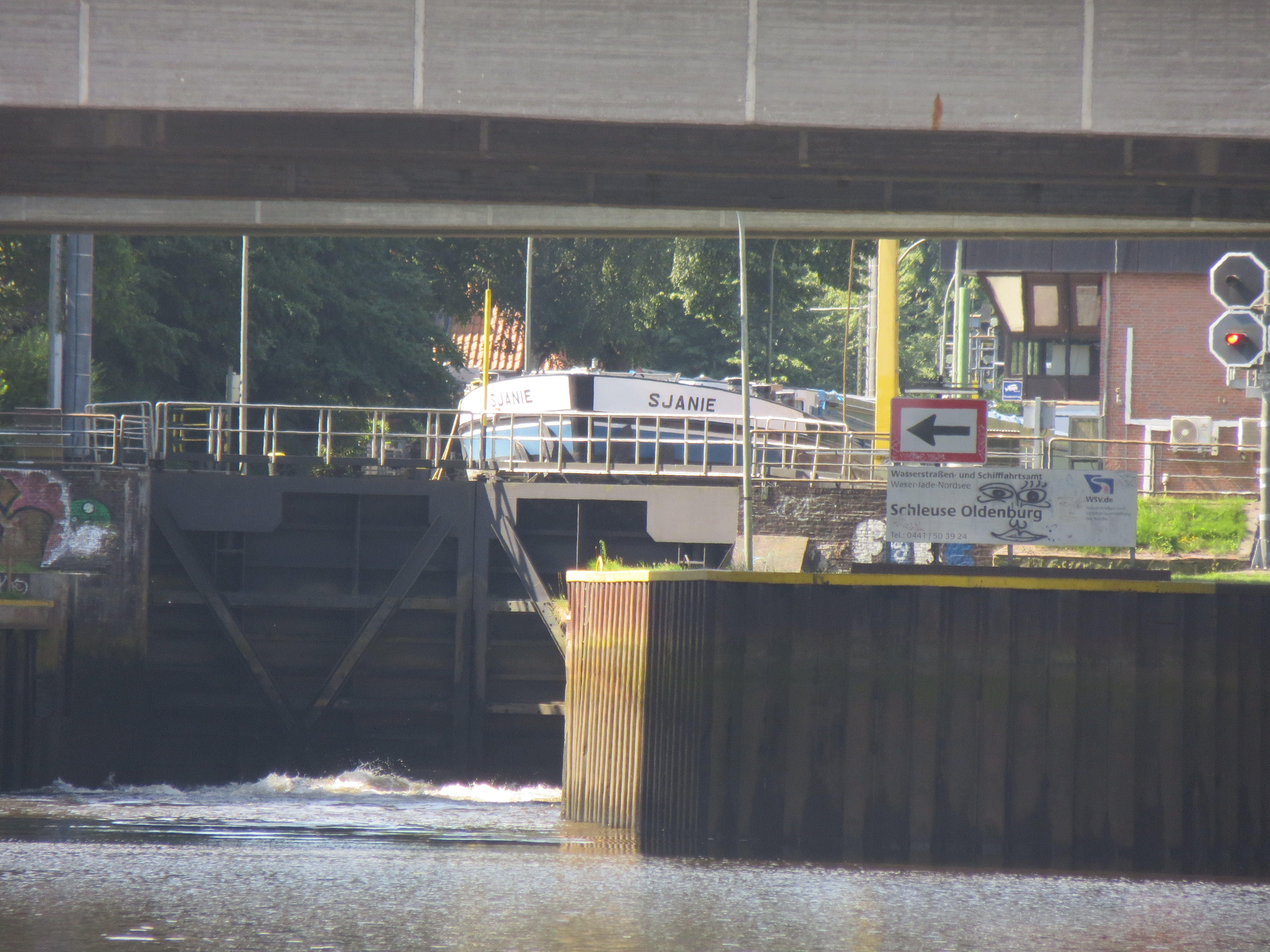 Wir warten vor den Schleuse, bis wir dran sind. Es wird noch einen Moment dauern, denn gerade ist aus dem deutlich höhergelegenen Küstenkanal das Binnenschiff Sjanie in die Schleuse eingefahren. Oberhalb der Schleusentore sehen wir den Bug des Schiffes.