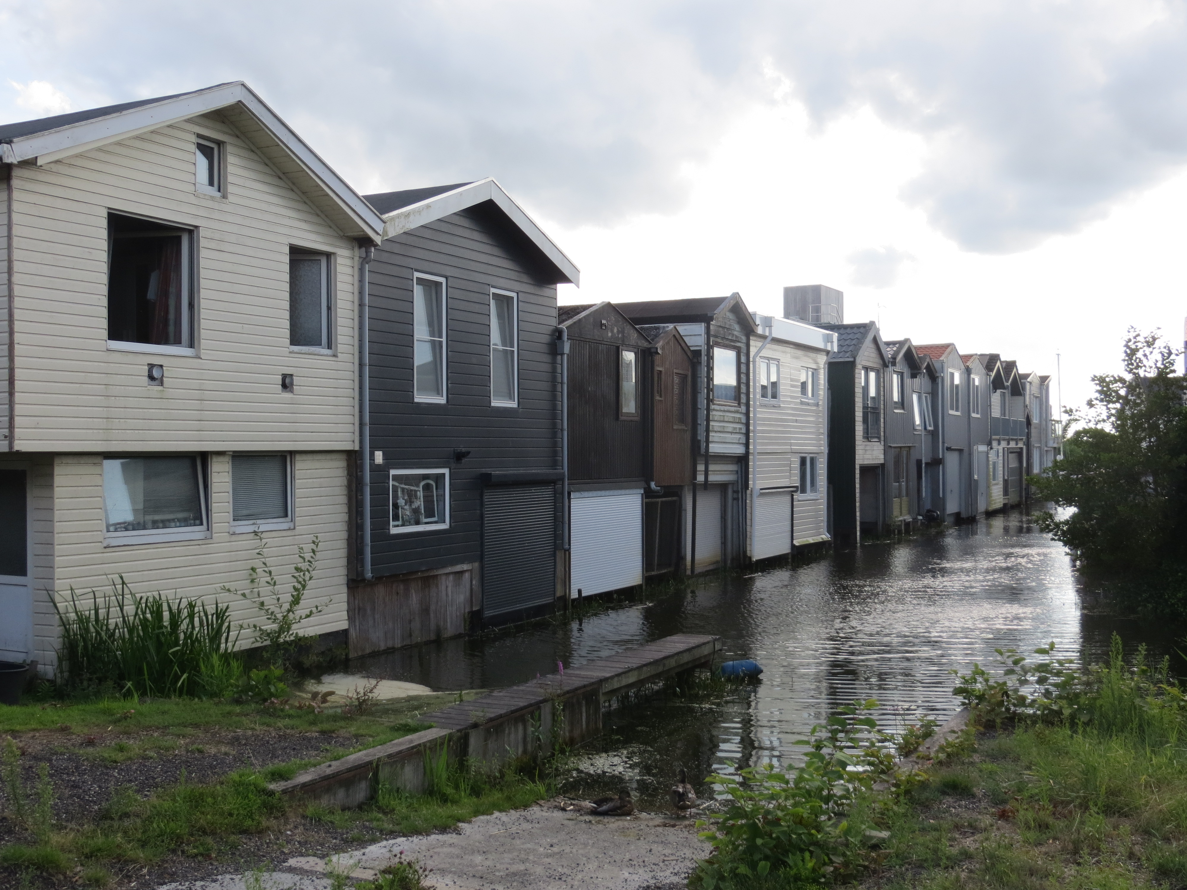 Das Zuidlaardermeer ist ein Naherholungsgebiet von Groningen. Hunderte von Booten liegen in den Häfen am Ufer des Sees. Hier eine Reihe von Häusern, die jeweils ihre eigene Bootsgarage integriert haben.