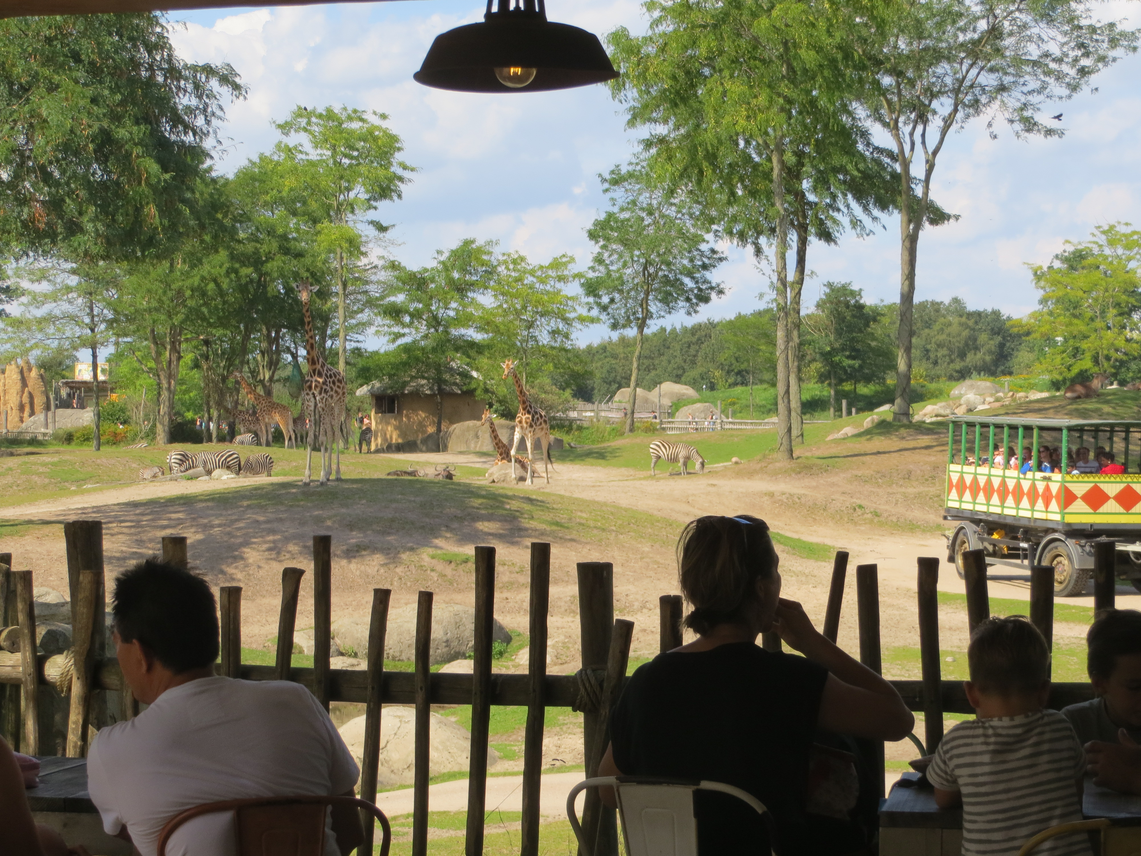 Der Zoo ist mit mehrere Restaurants ausgestattet. Dieses hier liegt direkt am großen Serengeti-Areal. Die Besucher sitzen am Tisch und können in aller Ruhe die Tiere beobachten. Als Besonderheit werden hier Giraffen, Zebras, Nashörner sowie Gnus und andere Antilopen gemeinsam in einem Gehege gezeigt.