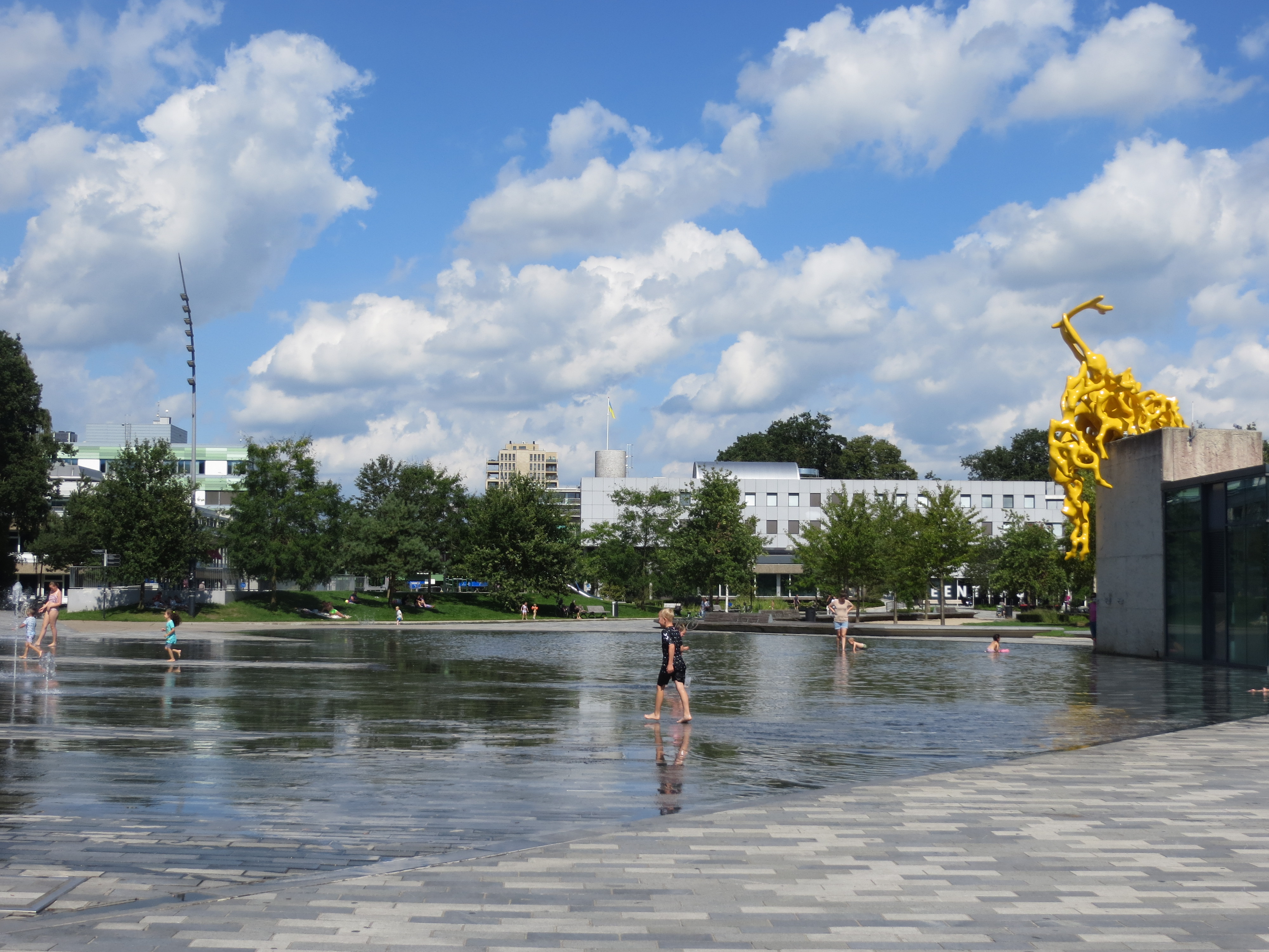 Vor dem Eingang zum Zoo ist ein riesiger Platz. Er ist nicht ganz eben gepflastert, und an den tieferen Stellen kommt Wasser aus dem Boden und bildet riesige Pfützen. Eine willkommene Kühlung für heiße Füße.