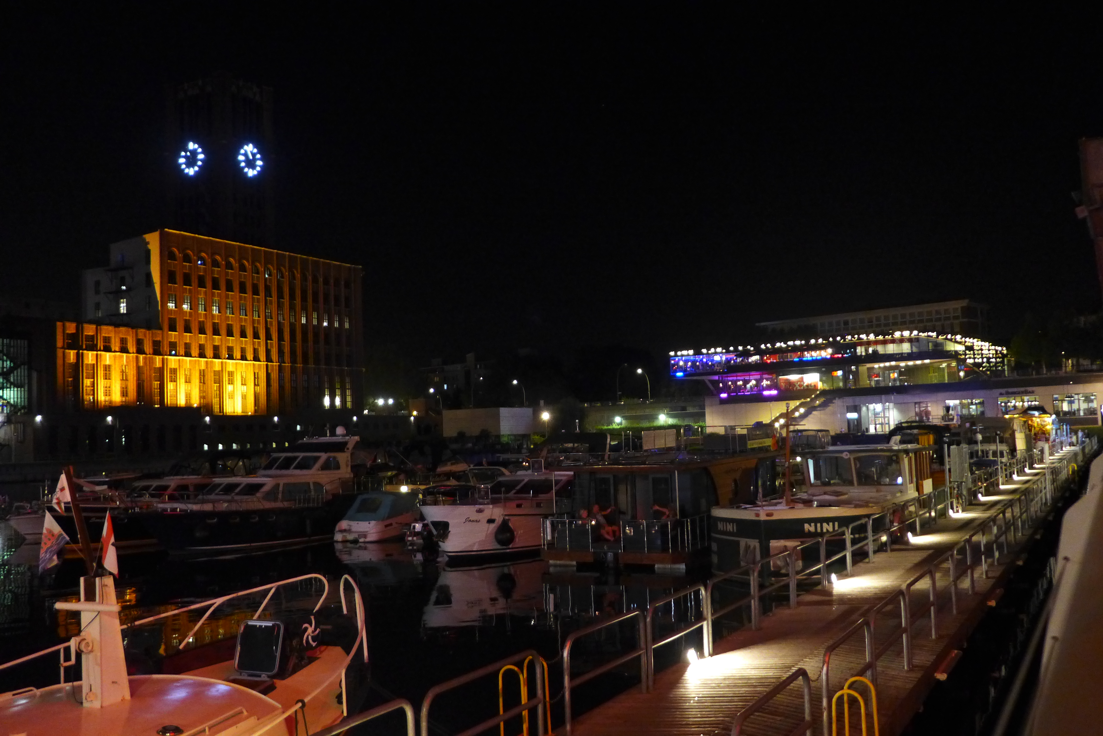 Das Ullsteinhaus links im Bild ist ein Baudenkmal des Backsteinexpressionismus und wurde Mitte der 1920er Jahre errichtet. Es ist mit einer Höhe von 77 Metern eine weithin sichtbare Landmarke und ein architektonisches Wahrzeichen dieses Ortsteils. Bis zur Fertigstellung des Friedrich‒Engelhorn‒Hochhauses im Jahr 1957 war es 30 Jahre lang das höchste Hochhaus Deutschlands. Die vier beleuchteten Uhren am ansonsten unbeleuchteten Turm scheinen in der Luft zu schweben. Hinten rechts ein modernes Gebäude mit drei Restaurants.