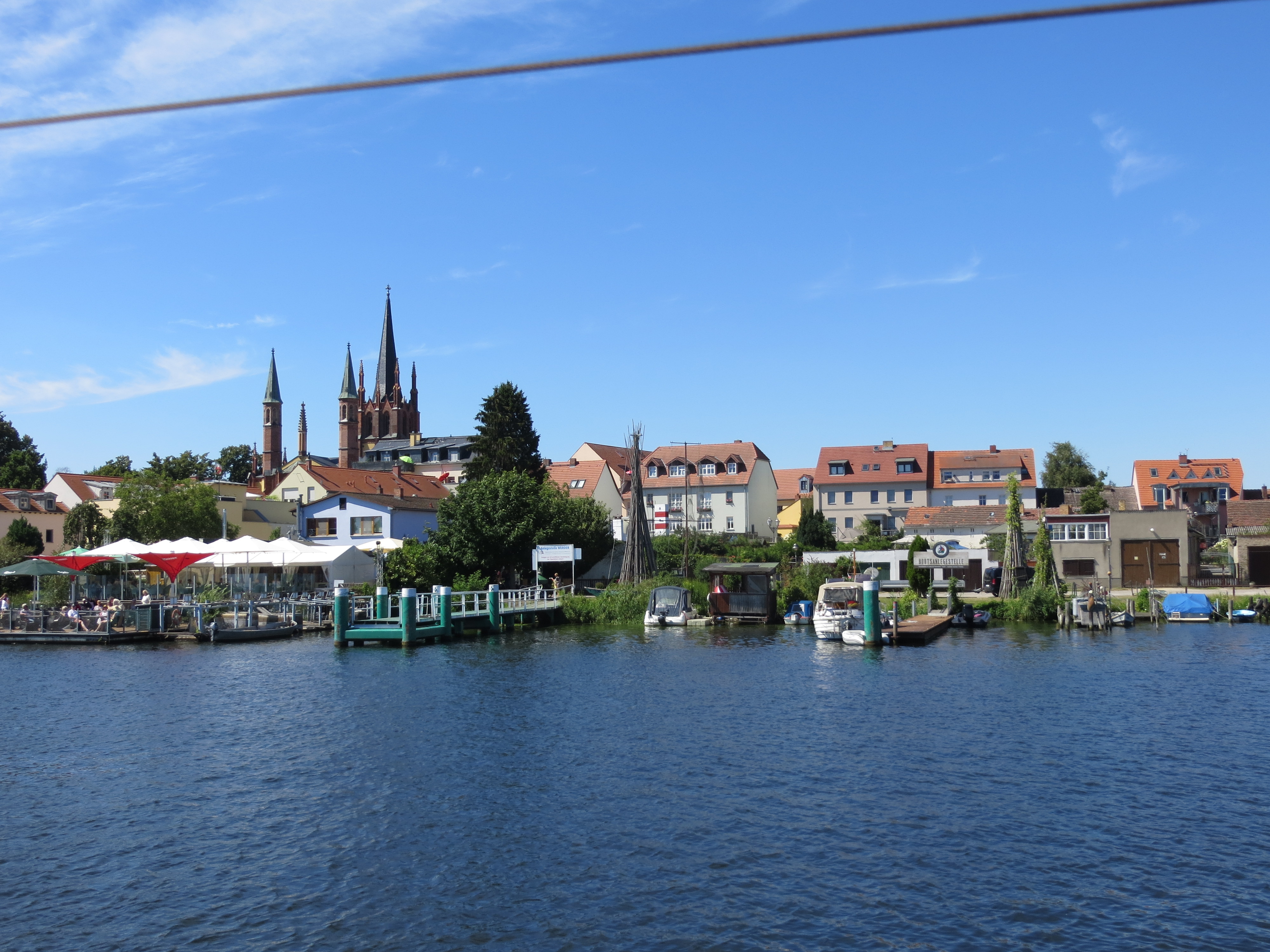 Einer der touristischen Schwerpunkte an der Havel zwischen Brandenburg und Potsdam ist die Insel Werder. Ein gemütliches Städtchen mit der imposanten Heilig‒Geist‒Kirche. Links im Vordergrund ein Fischrestaurant mit eigener Räucherei und einer Terrasse mit tollem Ausblick. Nur Essen gehen sollte man dort besser nicht...