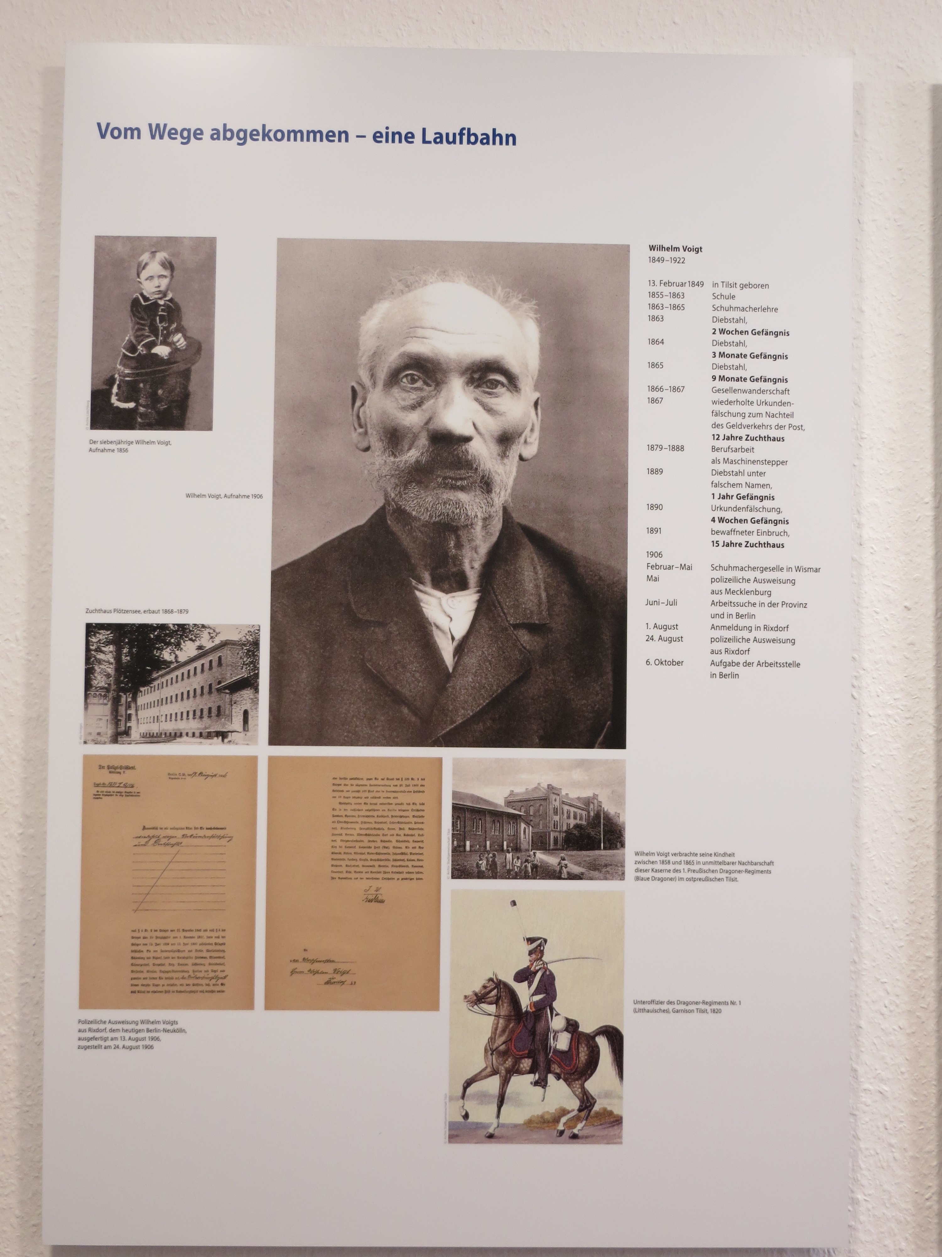 Der gelernte Schuhmacher Wilhelm Voigt (1849 ‒ 1922) erwarb sich seinen Lebensunterhalt mit Urkundenfälschungen, Einbrüchen und Diebstählen. Das Rathaus von Köpenick hatte es ihm angetan, weil der Ort über die Eisenbahn an Berlin angebunden war und somit ein idealer Fluchtweg bestand. Voigt wusste, dass erhebliche Geldbestände im Rathaus gelagert waren. Er kaufte sich eine gebrauchte Uniform eines Hauptmanns und fuhr am 16. Oktober 1906 zur Militärbadeanstalt in Plötzensee. Die dortigen Wachen stellte er unter sein Kommando und fuhr mit dem Trupp mit der Bahn nach Köpenick. Am Bahnhof spendierte er den Soldaten Bockwurst und Bier. Anschließend wurde das Rathaus besetzt, der Bürgermeister verhaftet und die Stadtkasse beschlagnahmt. Voigt verschwand mit den ca. 4000 Mark und tauchte in Berlin unter. Zehn Tage später wurde er beim Frühstück verhaftet, nachdem ein ehemaliger Zellengenosse, der von Voigts Plänen wusste, der Polizei in Erwartung der hohen Belohnung einen Tipp gegeben hatte.