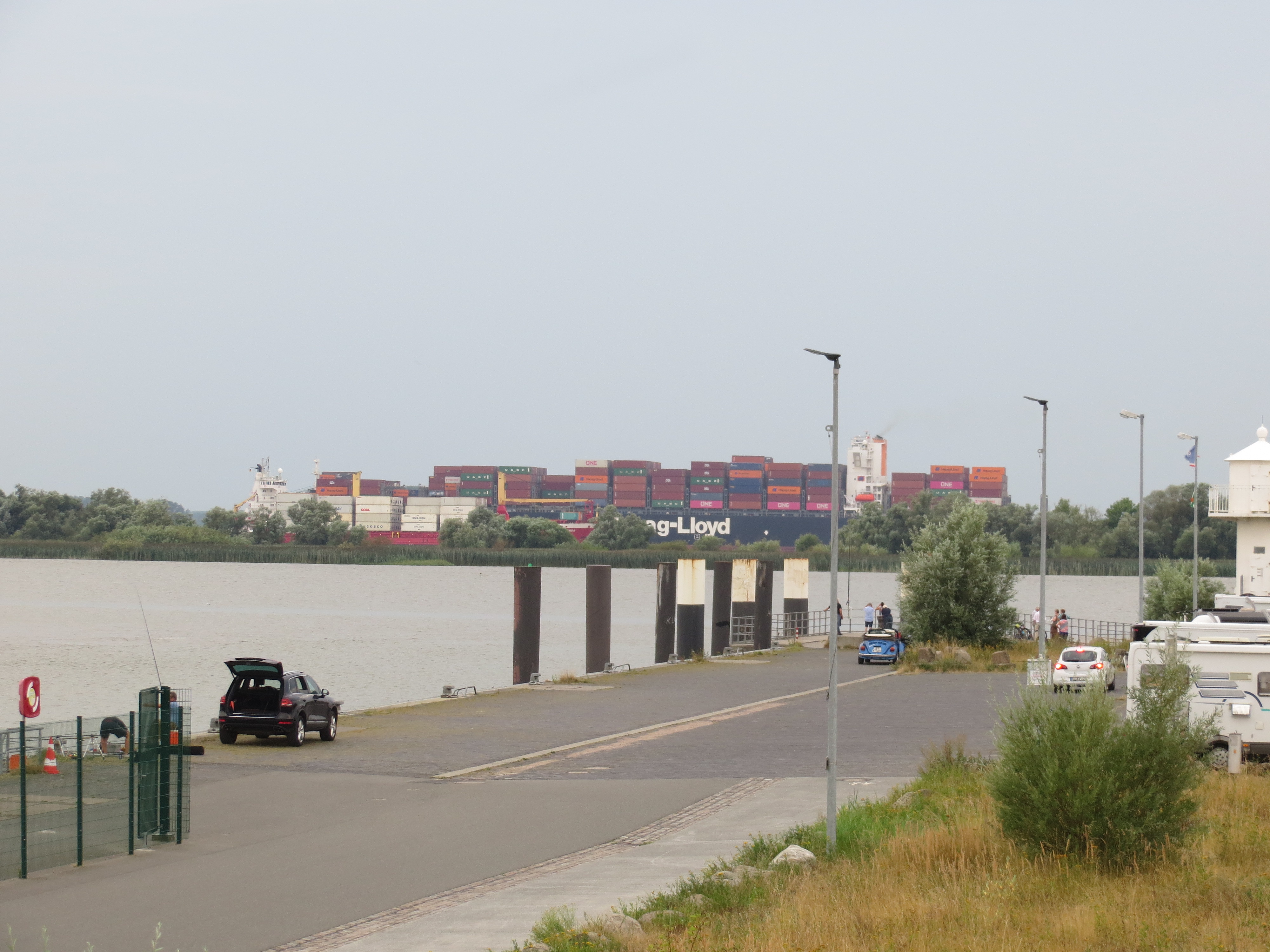 Anfänglich hatten wir uns gefragt, ob man wohl hinter der schönen Elbinsel vor der Hafenausfahrt auch den Schiffsverkehr auf der Elbe sehen kann.