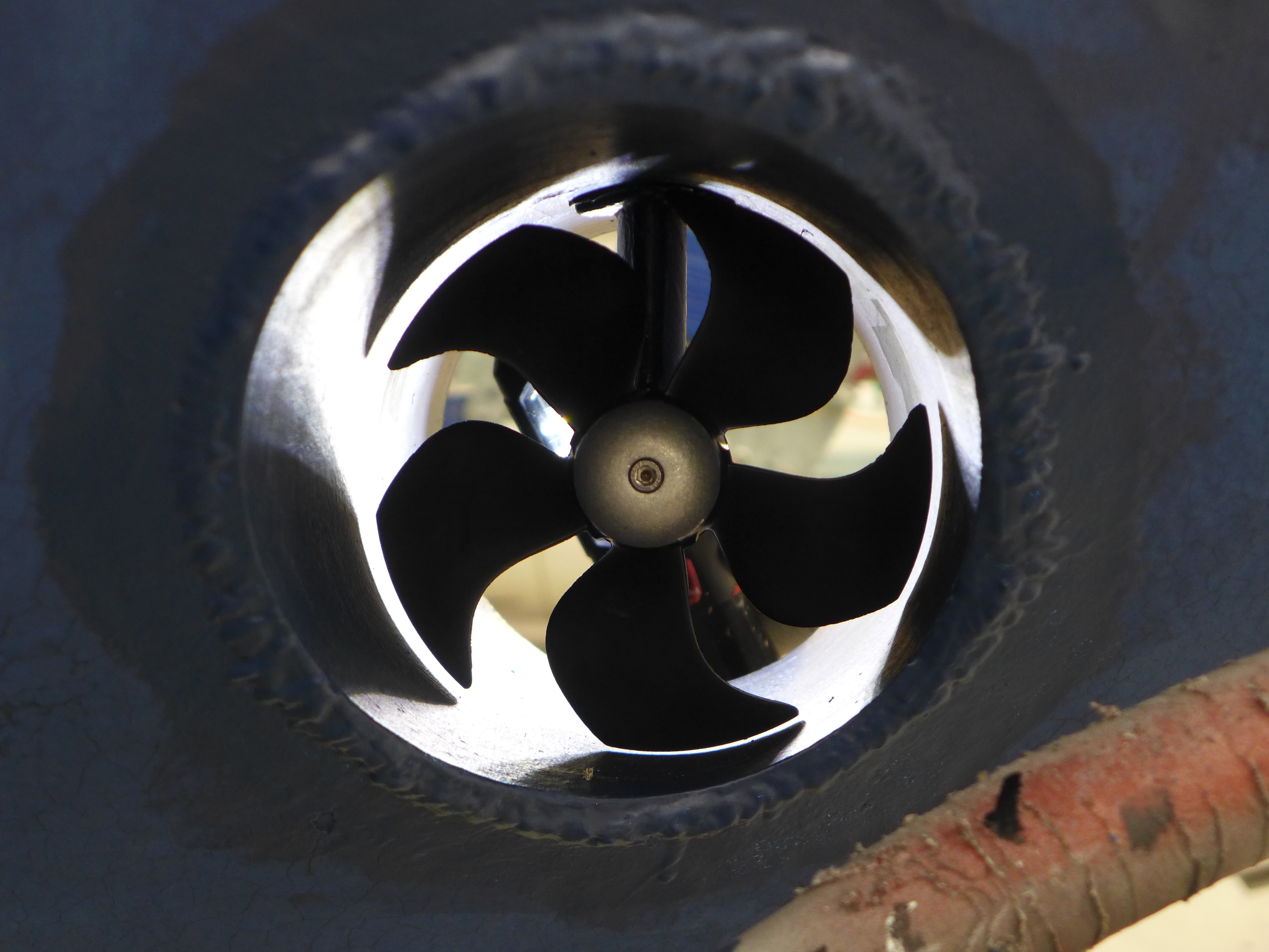 Jetzt kann die Schraube montiert werden. Weil wir einen Sidepower-Bugstrahler mit einem Vetus-Tunnelrohr kombiniert haben, sitzt die Achse des Winkelgetriebes nicht exakt in der Tunnelmitte, und die Schraube hat unten weniger Freiraum als oben. Aber es reicht.