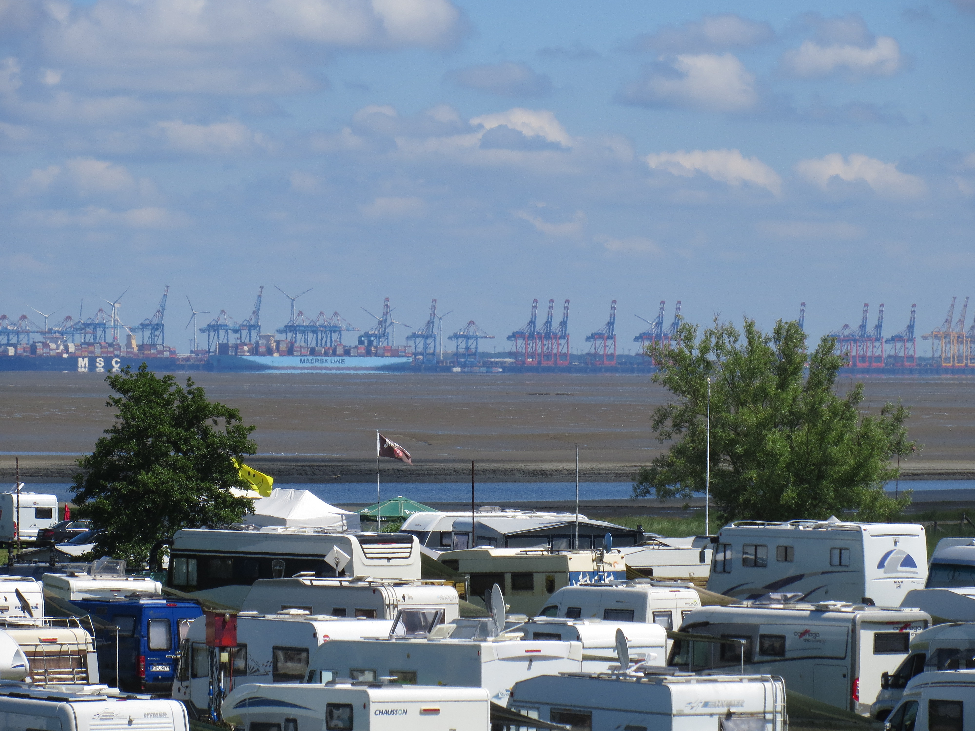 Die Columbuskaje in Bremerhaven ist 15km entfernt, sieht aber erstaunlich nah aus. Im Vordergrund die Wohnmobile des Campingplatzes, der direkt an den Hafen angrenzt. Dazwischen ein Priel direkt am Hafen, Schlick bis Bremerhaven und die kaum sichtbare Fahrrinne der Weser. Vor den Kränen liegt die 400m lange Mathilda Maersk.