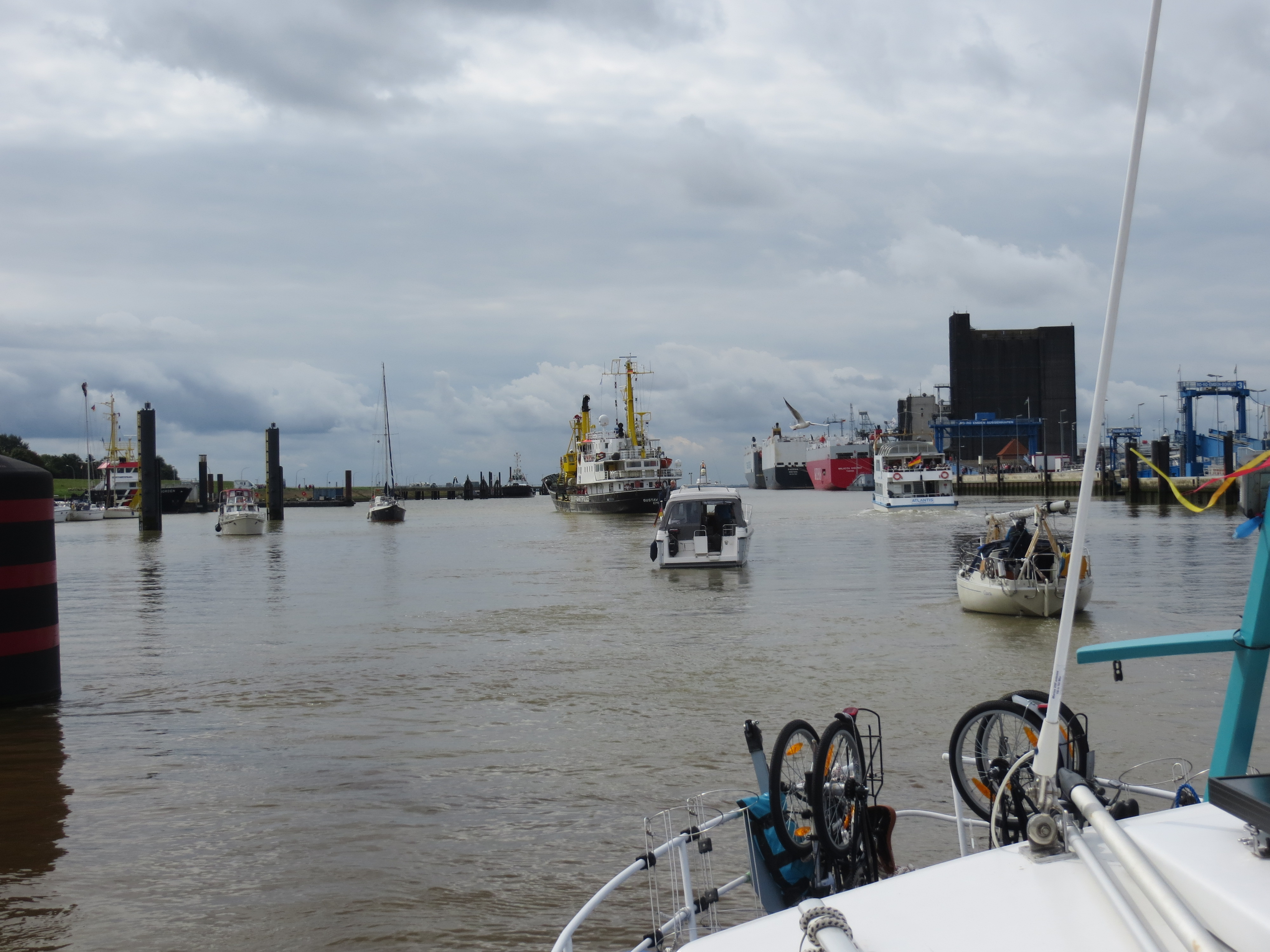 In der Hafenausfahrt ist ganz schön was los. Ganz rechts im Hintergrund sieht man drei Auto-Transportschiffe. Das Emdener VW-Werk verschifft hier seine Fahrzeuge.