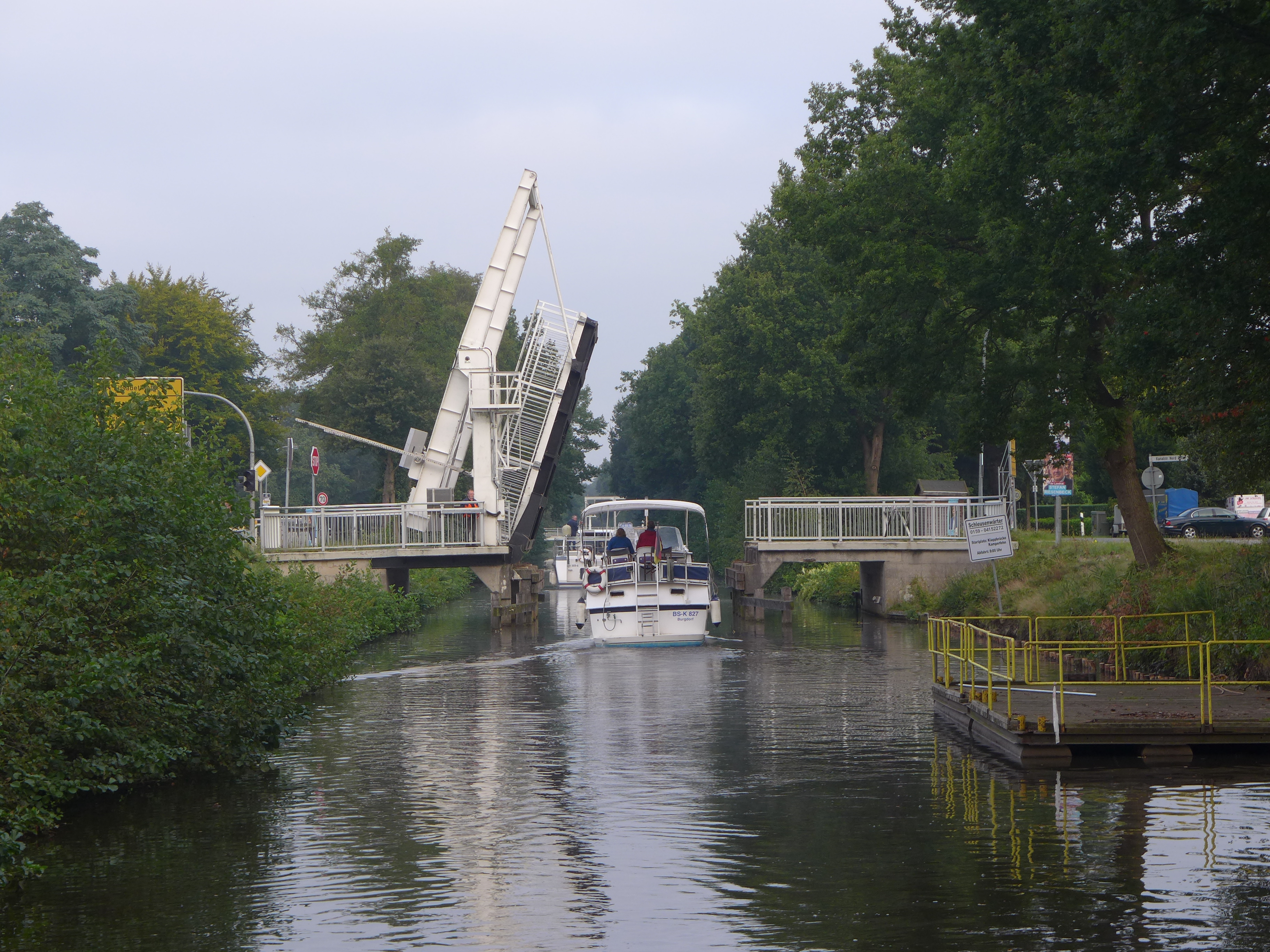 Gefahren wird im Konvoi. Alle Boote, die in nördlicher Richtung fahren wollen, müssen sich um 8:00 an der ersten Brücke versammeln. Denn es müssen sieben Brücken hochgeklappt werden für die Boote. Dazu begleitet ein Schleusen- und Brückenwärter die Boote auf dem Fahrrad.