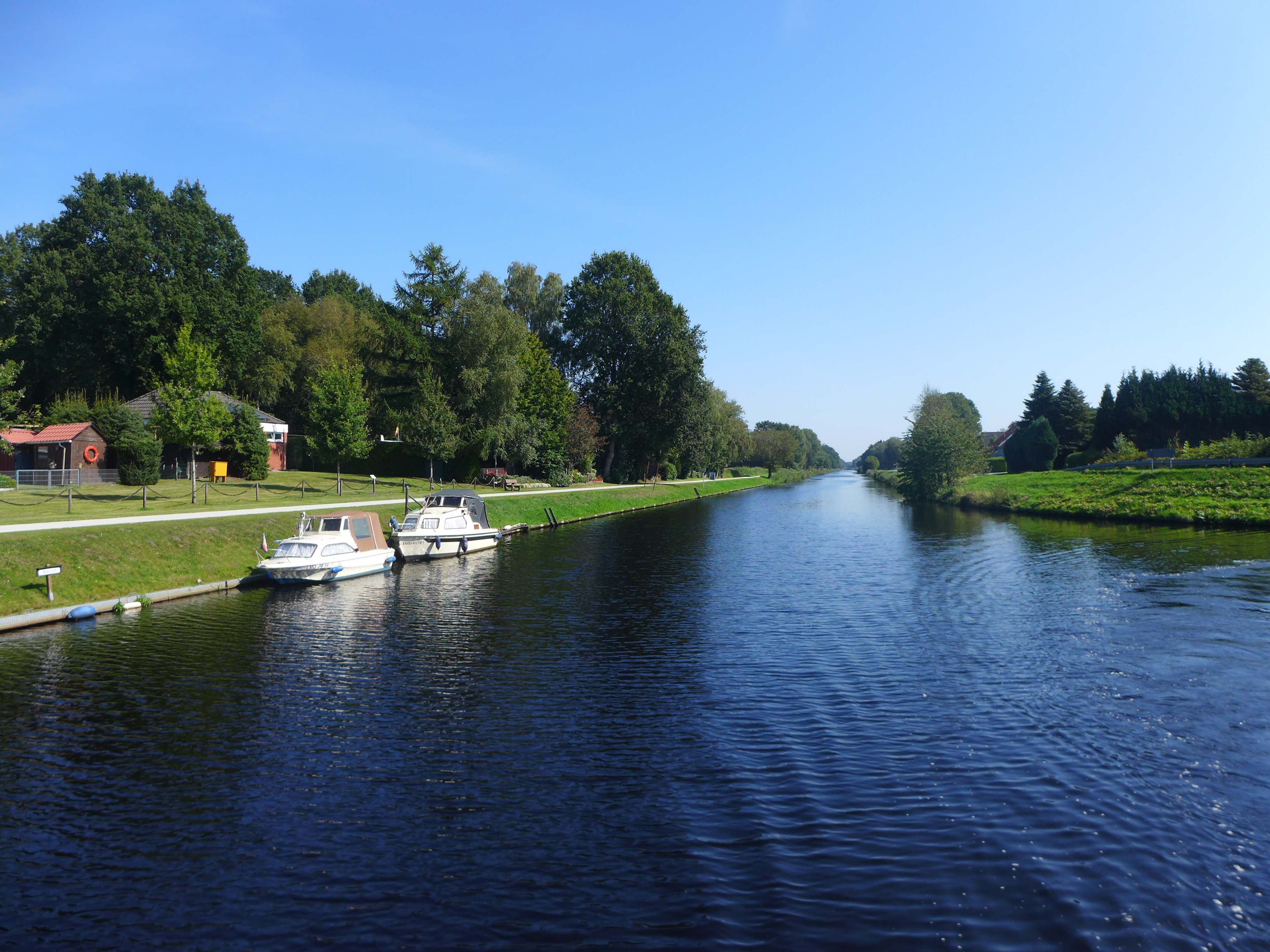 Der Nordgeorgsfehnkanal mündet in den Ems-Jade-Kanal. Dort kann man rechts nach Wilhelmshaven oder links nach Emden abbiegen. Wir wollen zuerst nach Aurich und dann nach Emden.