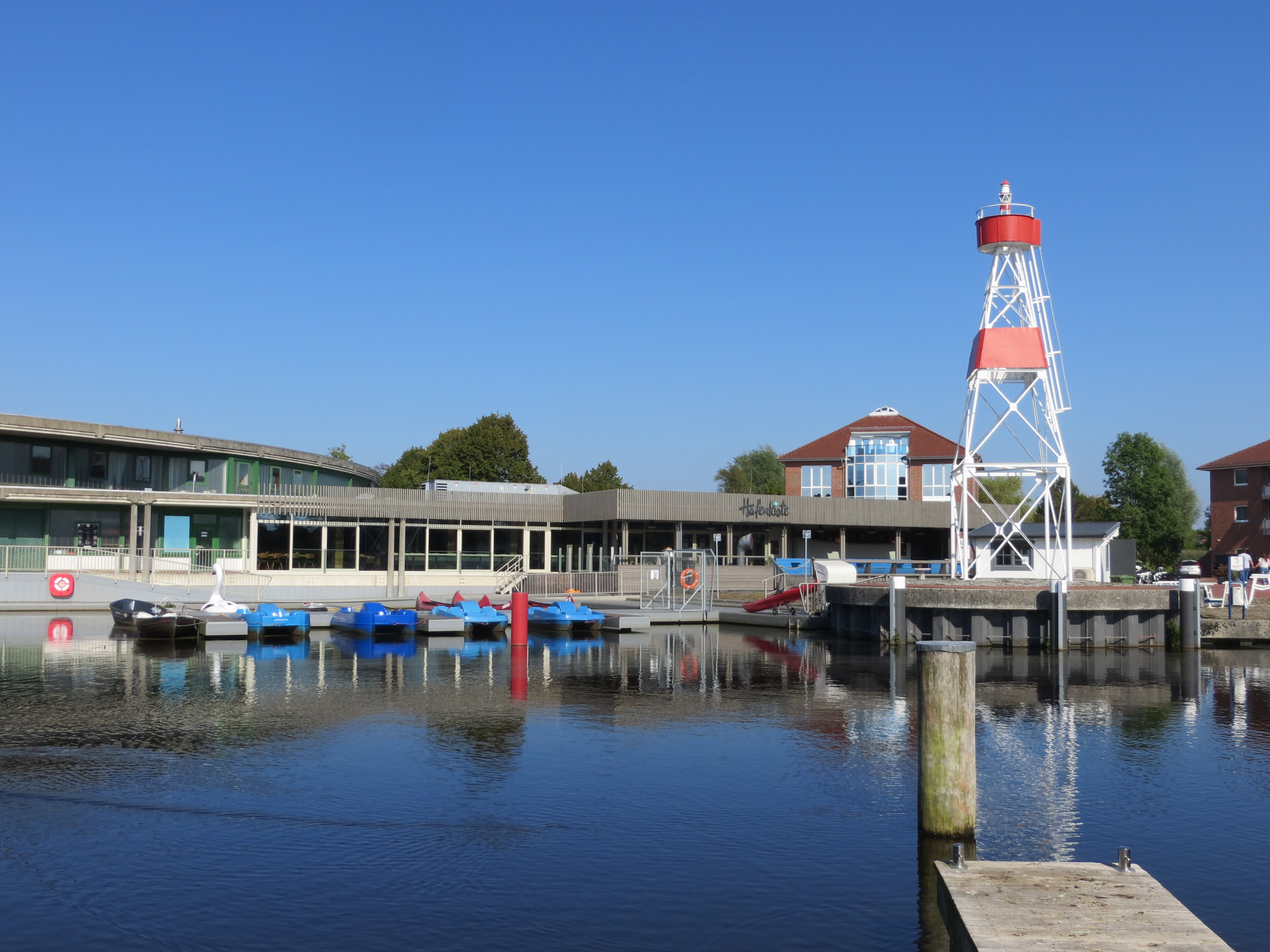 Hier der Blick vom Boot auf die Hafengebäude in Aurich.