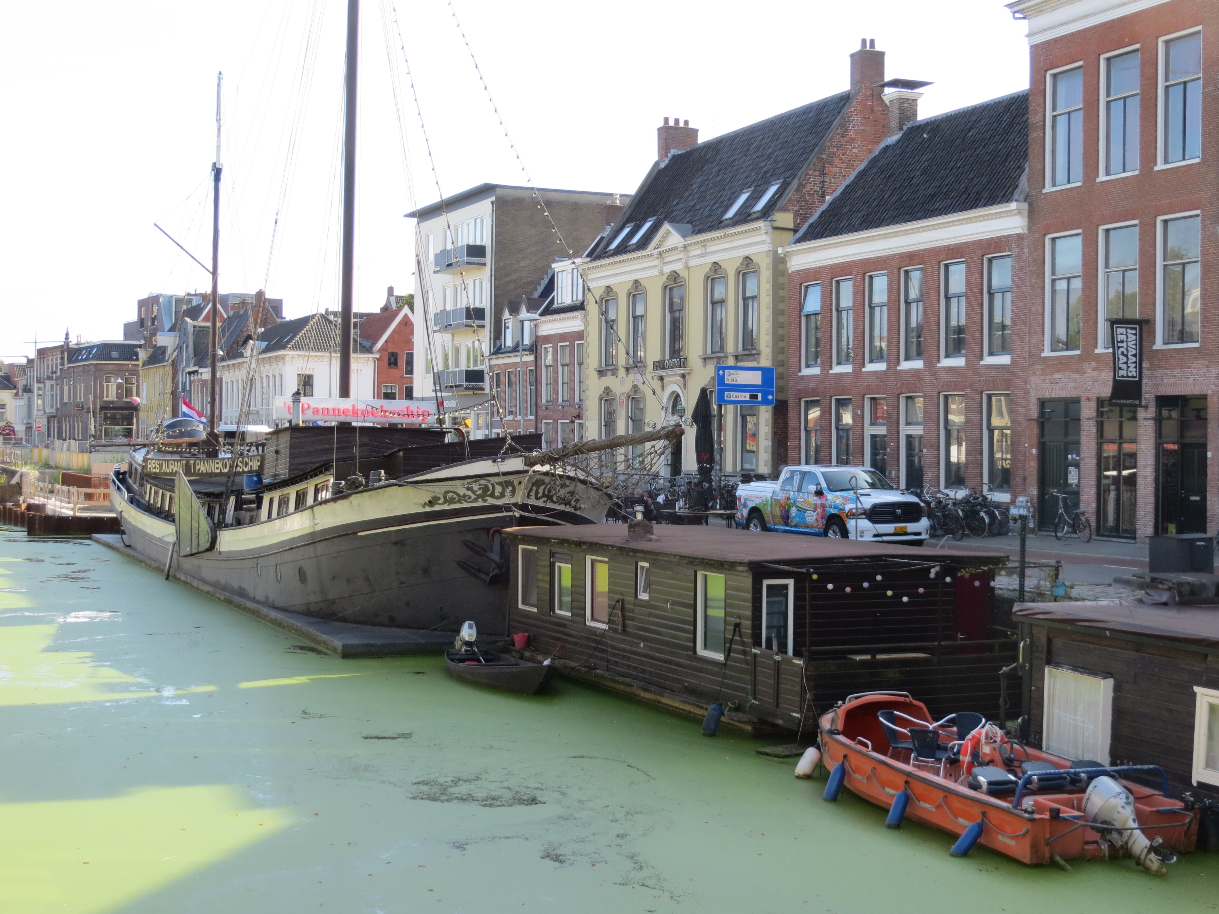 Groningen hat uns stark an Amsterdam erinnert. Es ist deutlich kleiner, aber auch hier finden sich abwechslungsreiche Häuser an der Straße und ebenso unterschiedlich Wasserfahrzeuge am Ufer.