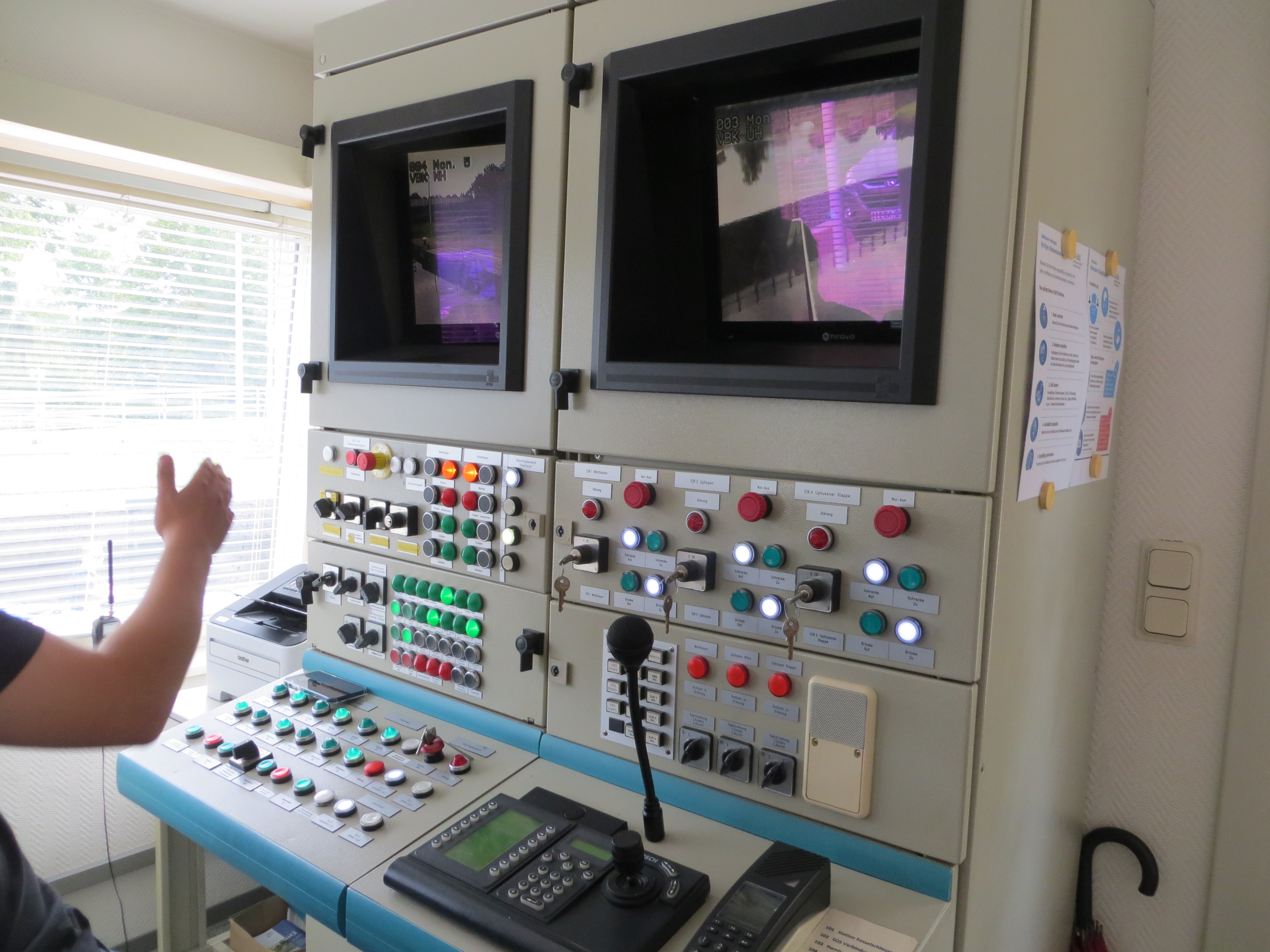 Hier der Steuerstand der Kesselschleuse. Der Schleusenwärter muss parallel noch eine weitere Schleuse fernbedienen sowie zwei Brücken.