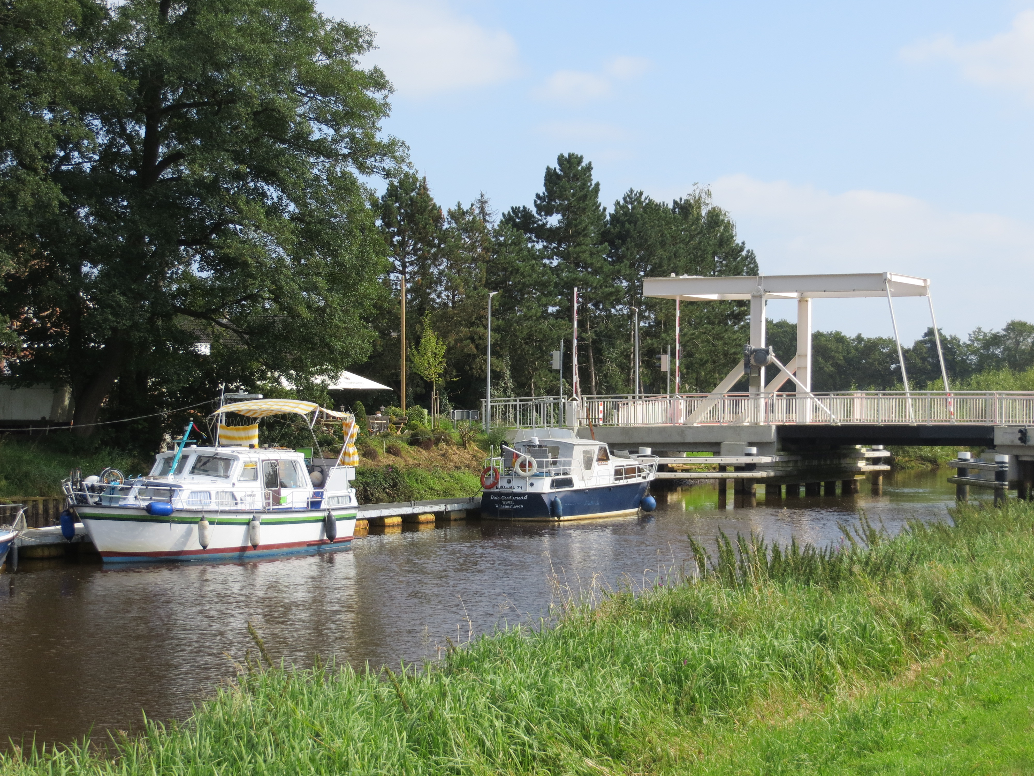 Übernachtet haben wir beim Wassersportverein Elisabethfehn (oder E'fehn, wie die Einheimischen abkürzen). Nach dem Verlassen des E'fehn-Kanals befanden wir uns wieder im Tidegebiet, denn die Gewässer haben über Jümme und Leda eine Verbindung zur Ems. Das wussten wir zwar, haben aber dennoch bei der Anfahrt die Strömung völlig unterschätzt. Beim Drehen vor der Brücke hat es uns dann ordentlich in die Abweiser gedrückt - das sind die Holzbalken links und rechts neben der Durchfahrt.