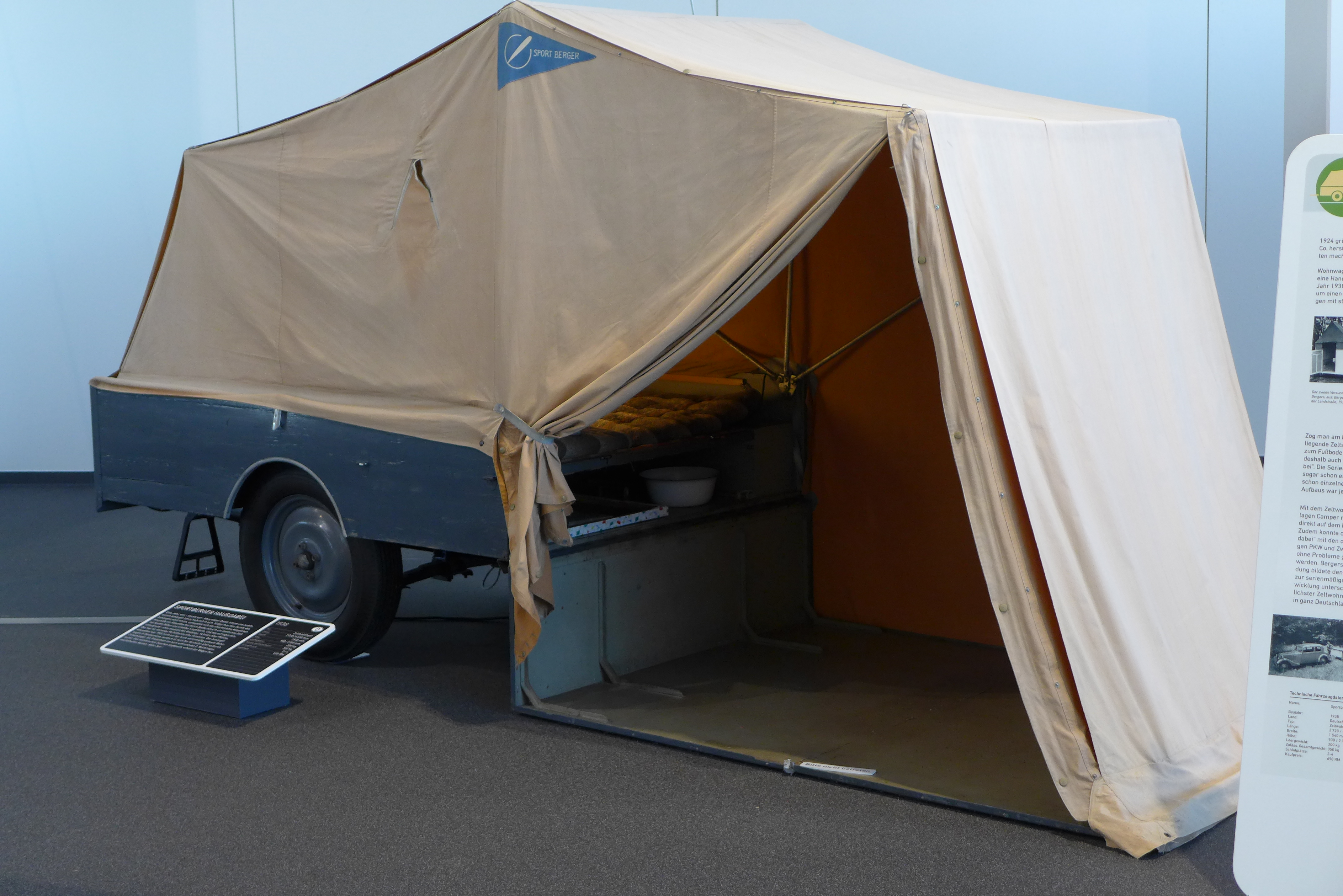 Zusammengeklappt ein kleiner flacher Anhänger, entfaltet sich im Handumdrehen ein geräumiges und stabiles Zelt. Baujahr 1938.