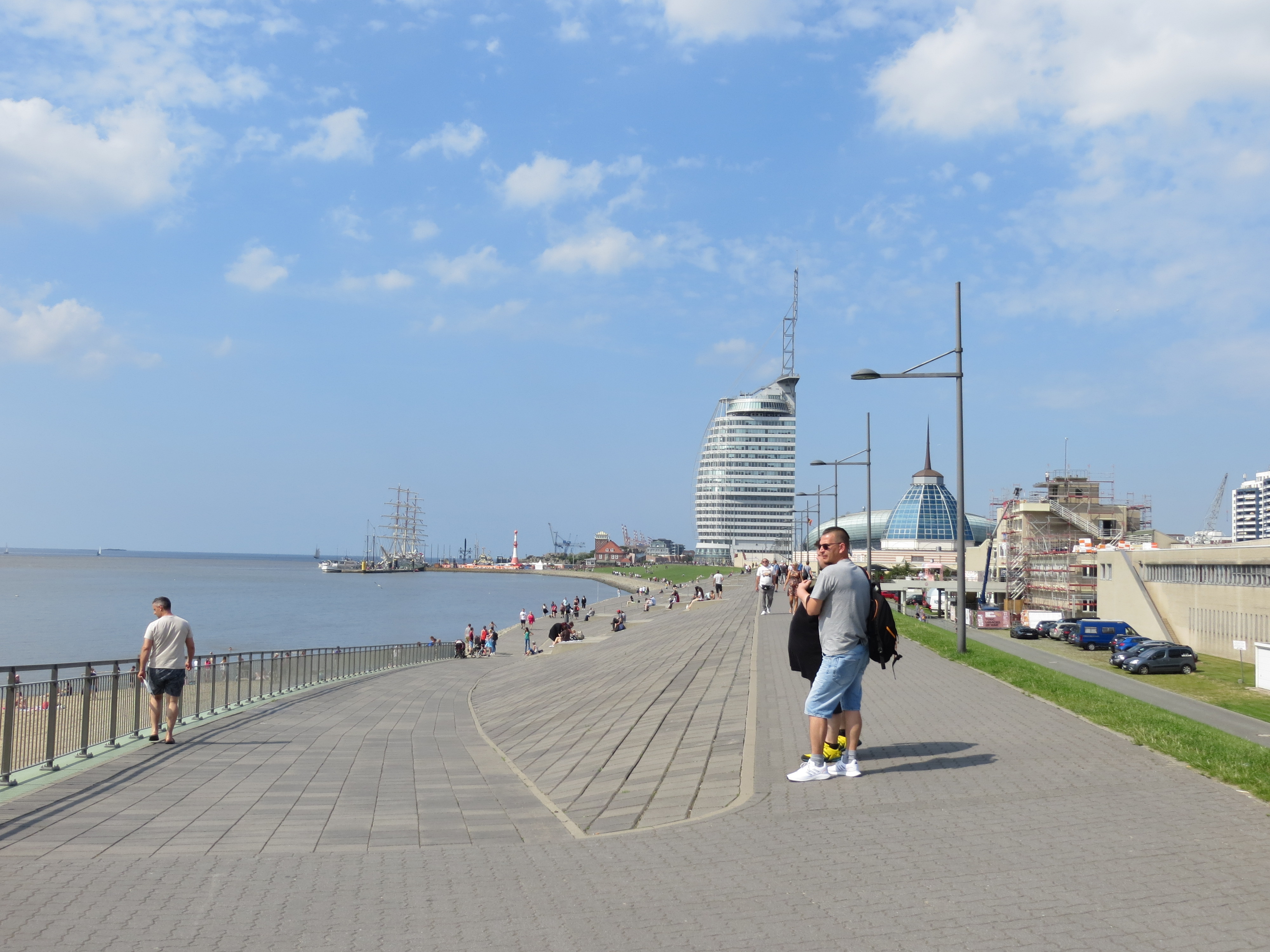 Vom Weser‒Strandbad Richtung Bremerhaven‒Mitte / Zoo sehen wir das "Atlantic Hotel Sail City" und rechts daneben die Kuppel des Mediterraneo. Dahinter verborgen das Klimahaus. Warum der Deich so scheußlich betoniert wurde, hat sich uns nicht erschlossen.
