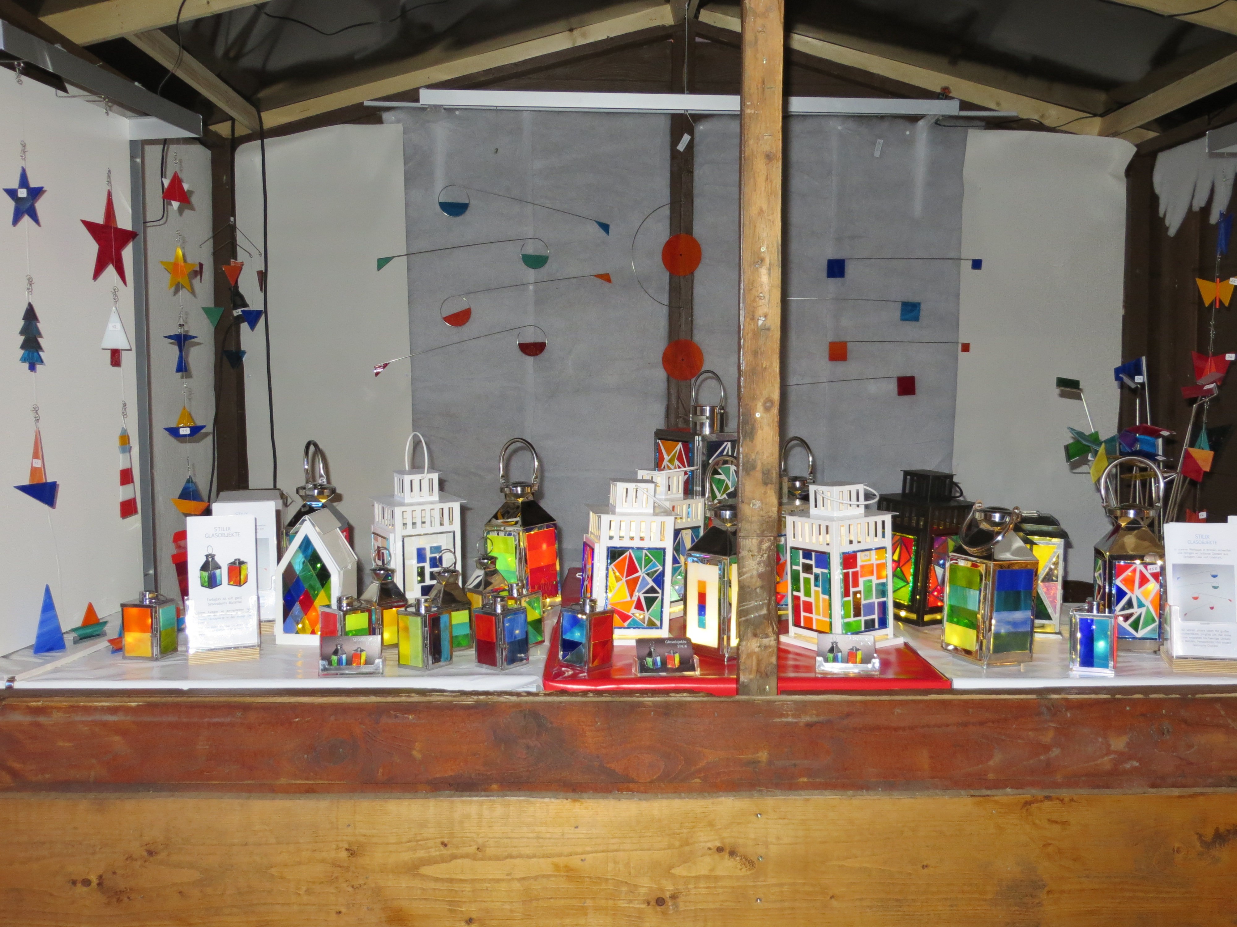 In der Mitte auf dem Tisch stehen die Laternen, rechts und links hängen die kleinen Objekte und an der Rückwand Mobiles und Gehänge.