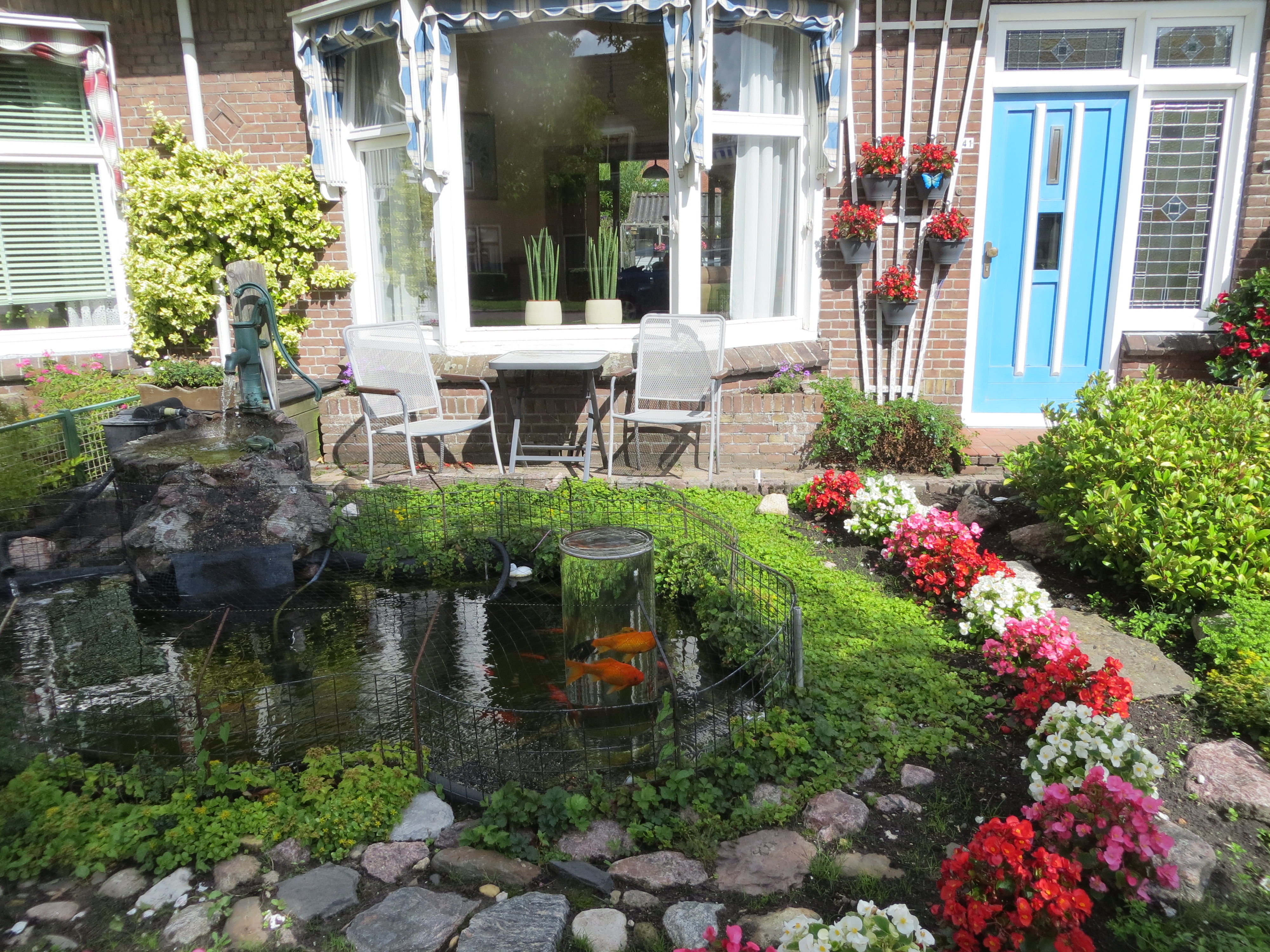 In einigen Straßen Dokkums haben wir unglaublich liebevoll gestaltete Vorgärten gefunden. Hier sehen wir neben den bunten Pflanzen auch einen Fischteich mit Fisch-TV.