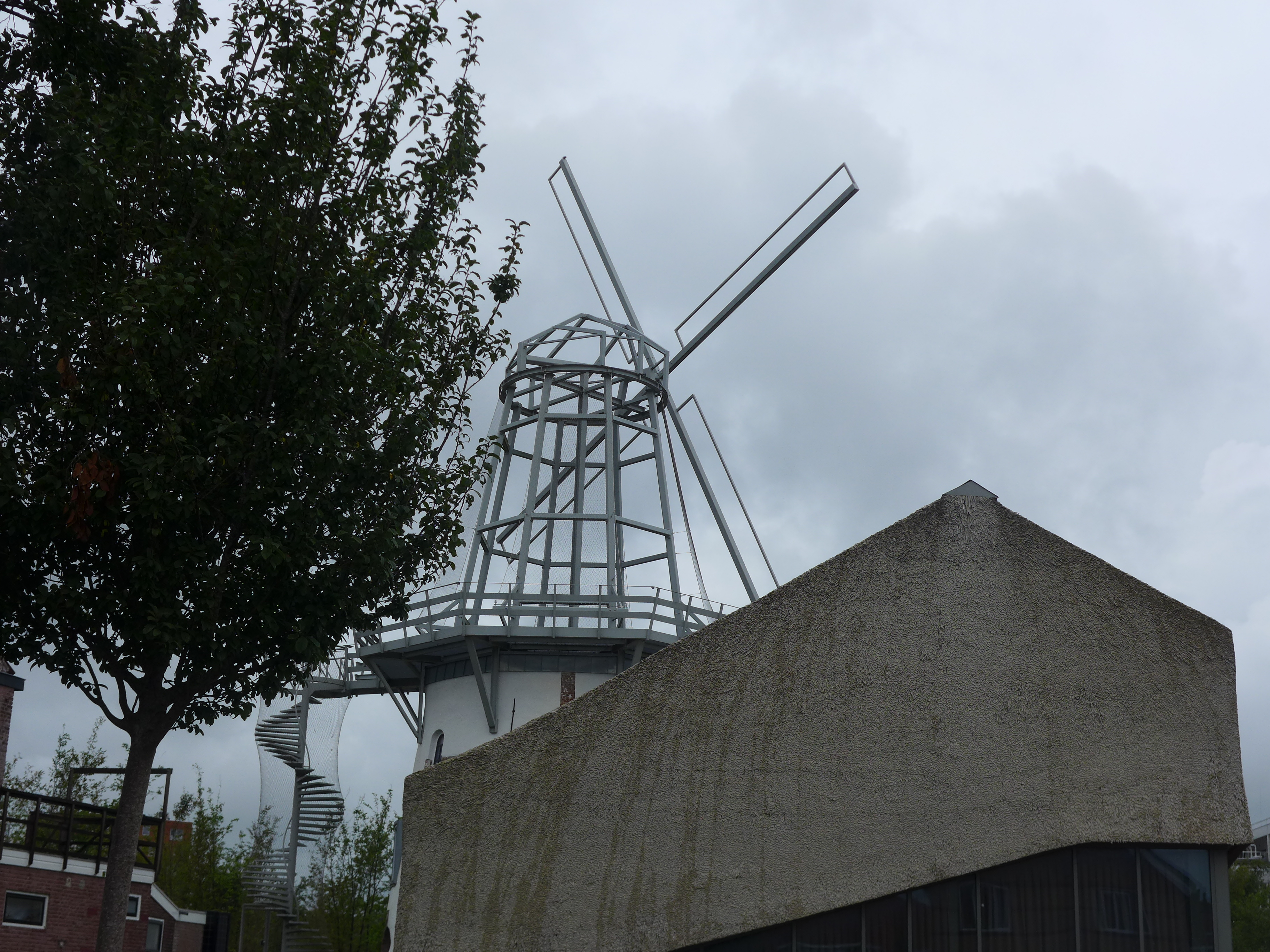 Hinter einem reetgedeckten Gebäude am Ufer erkennen wir das Unterteil einer alten Windmühle. Das Oberteil ist neu und symbolisiert mit Stahlträgern die ursprüngliche Form. Ein typisches Beispiel dafür, mit welcher Leichtigkeit die holländischen Architekten Altes mit Neuem kombinieren.