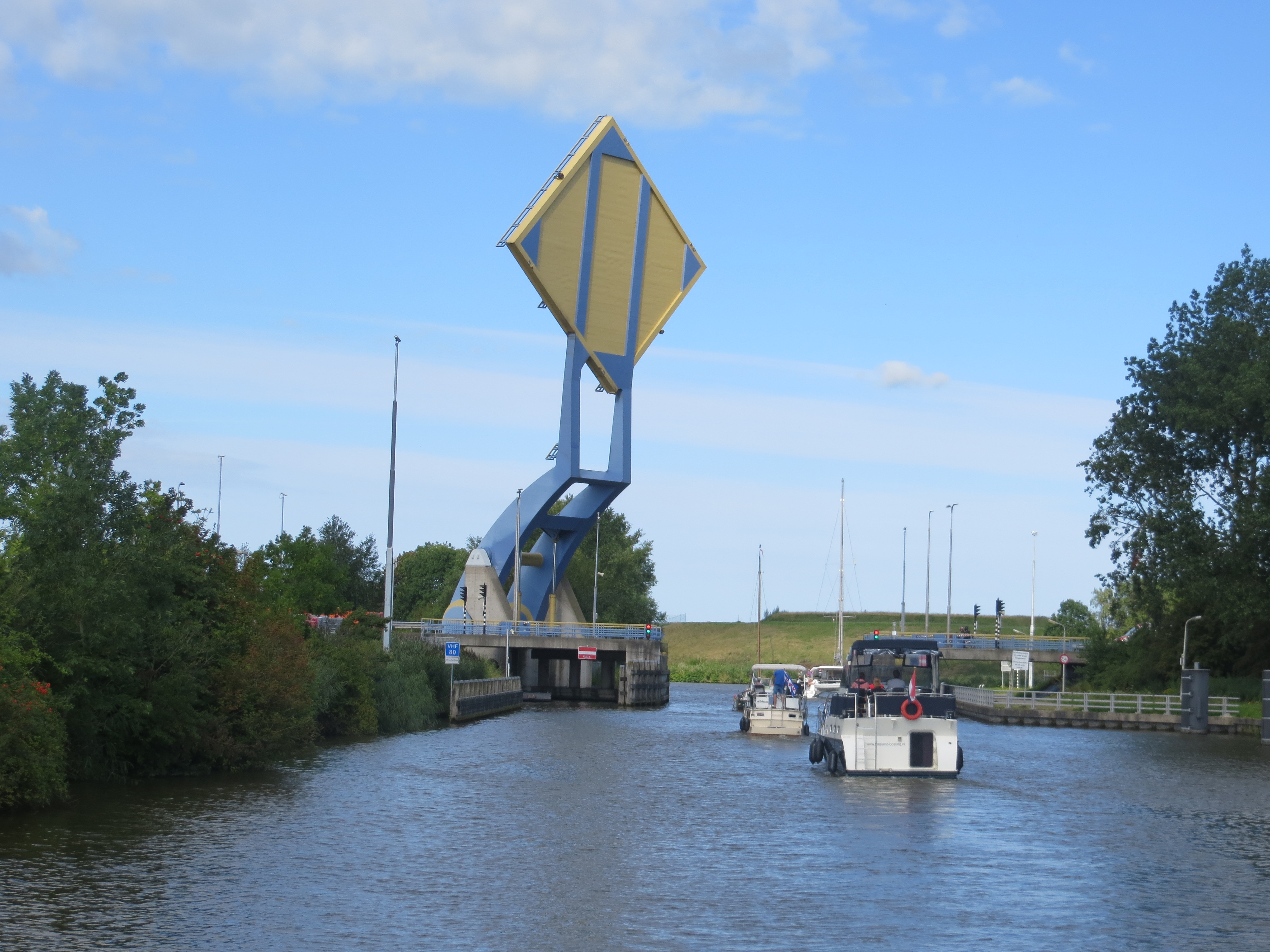 Wir verlassen Leeuwarden. Vor uns sehen wir wieder einmal eine Klappbrücke - doch diese ist anders. Die beiden Tragarme, die den beweglichen Teil der Brücke halten, sind in einem Winkel von 45° zur Fahrbahn angeordnet. Der gelb angemalte Teil der Brücke ist die Unterseite der hochgeklappten Fahrbahn. Das sieht beim Öffnen einfach spektakulär aus.